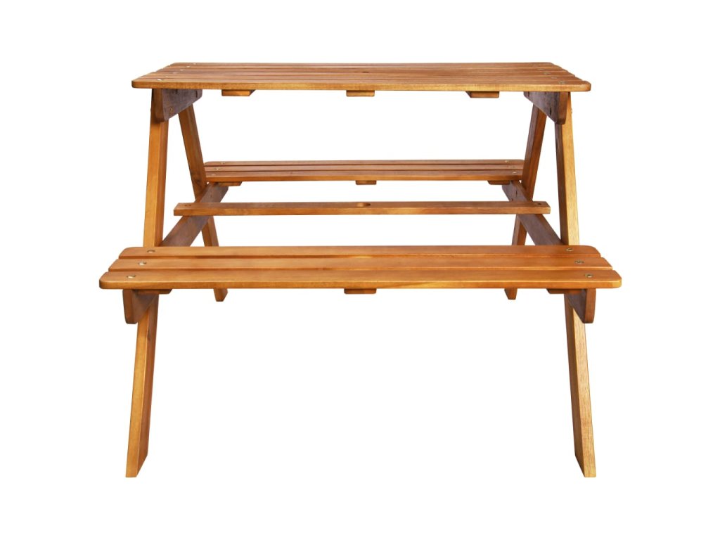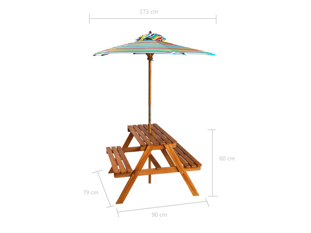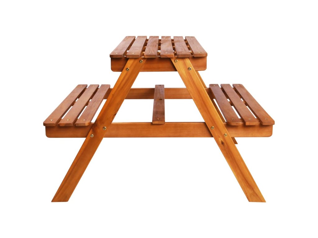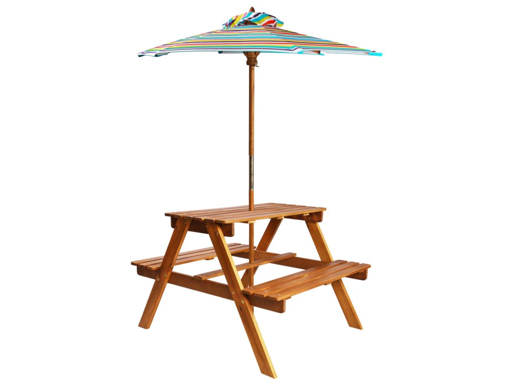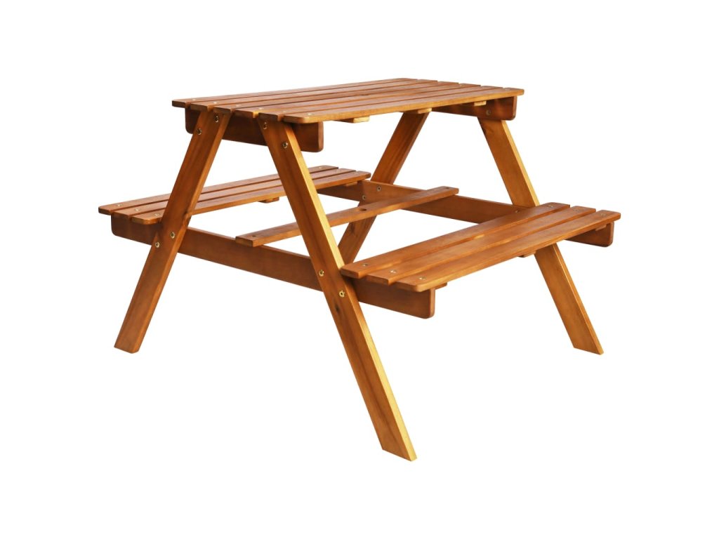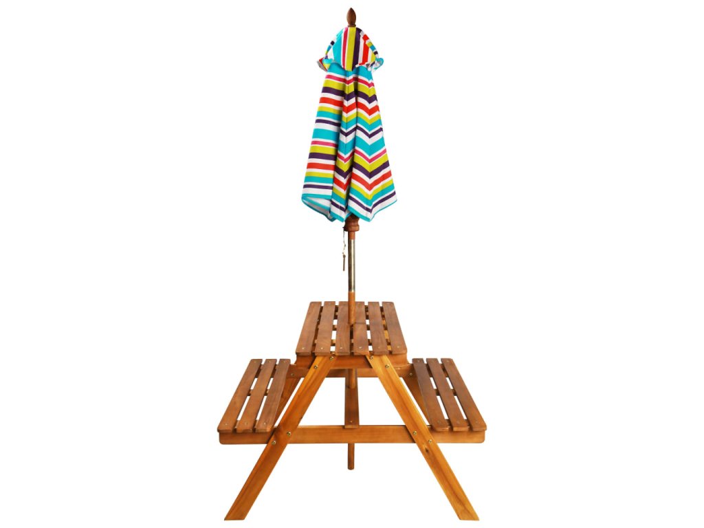 Piknikový stôl a lavica sú vyrobené z masívneho akáciového dreva, a sú mimoriadne pevné a odolné, ale zároveň ľahké. Je to ideálne miesto pre deti, kde môžu začať svoje nové umelecké a remeselné projekty. Môžu tu tiež privítať priateľov na rozhovor a hranie. Vďaka pribalenému veľkému slnečníku, ktorý vytvára tieň počas horúcich dní, budú deti chránené pred priamym slnečným žiarením. Slnečník je odnímateľný. Montáž piknikového stola je jednoduchá.