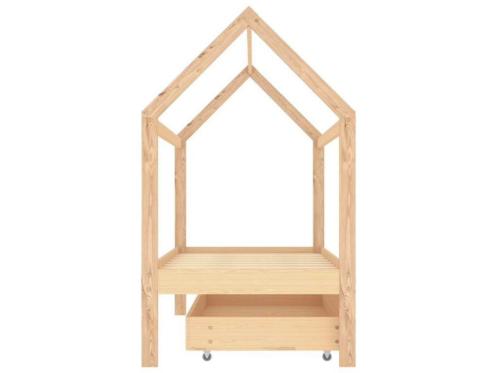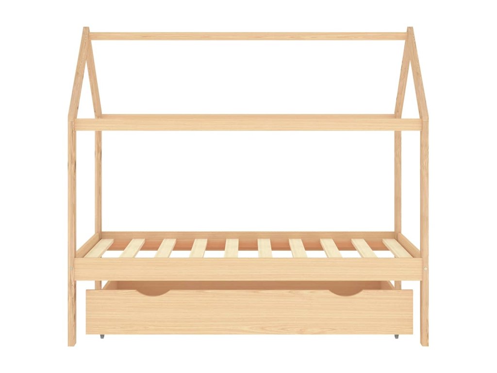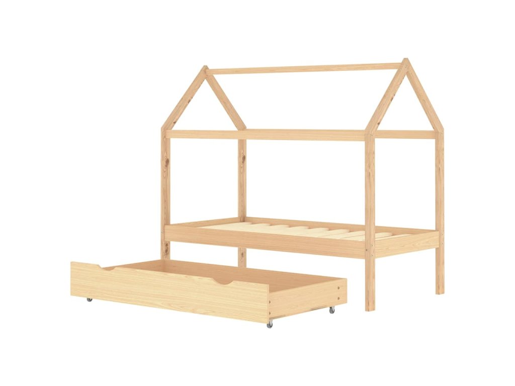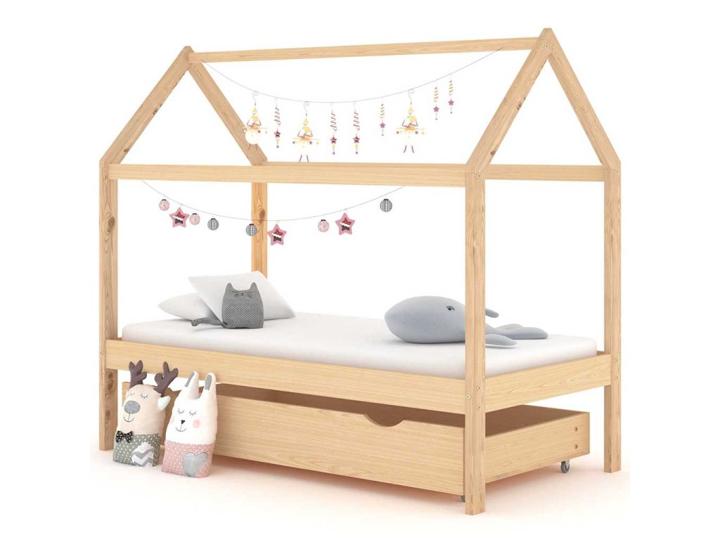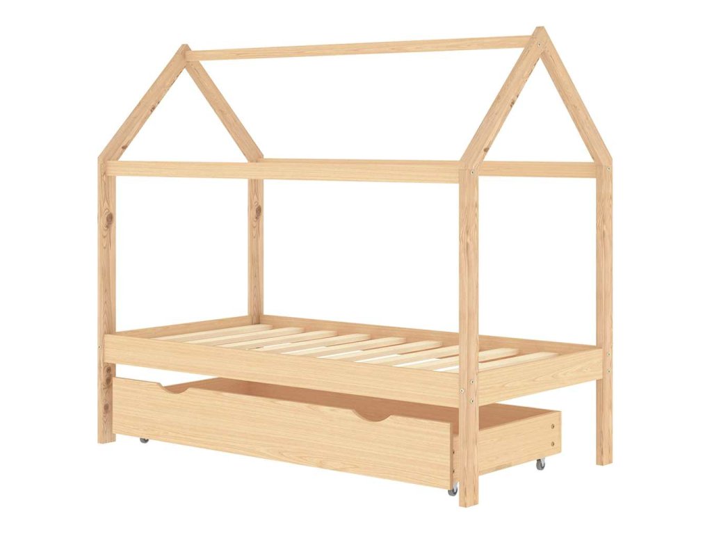 Posteľ je elegantne navrhnutá s rámom v štýle domčeka na strome, do ktorého môžete zavesiť závesy a vytvoriť tak súkromie pre svoje dieťa. Dá sa tiež použiť ako domček na na čítanie kníh alebo hranie pre vaše dieťa. Rám postele je vyrobený z masívneho borovicového dreva a je mimoriadne pevný a odolný. Silné lamely ponúkajú potrebnú oporu a sú veľmi pohodlné. Priložená zásuvka postele s 2 držadlami poskytuje dostatok úložného priestoru na uloženie zloženého oblečenia, hračiek atď., vďaka čomu bude vaša izba čistá a uprataná. Ľahko pohyblivé kolesá fungujú na podlahách s kobercom aj na drevenej podlahe. Tento rám postele je vhodný pre matrac s rozmermi 80 x 160 cm.