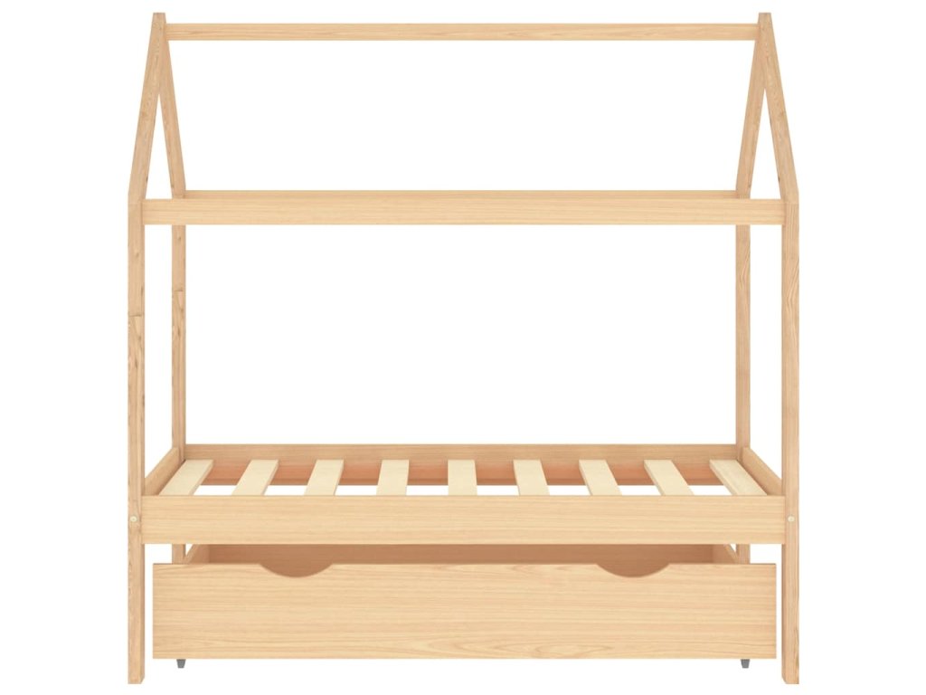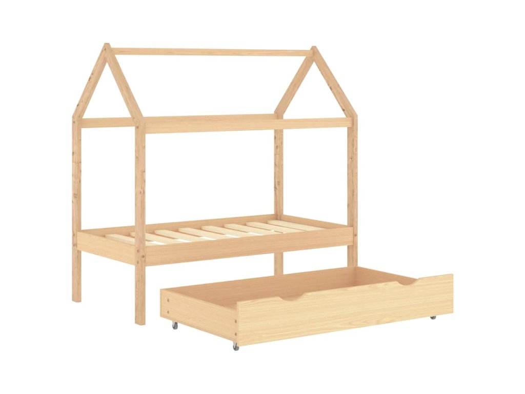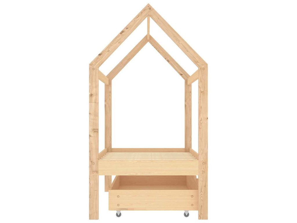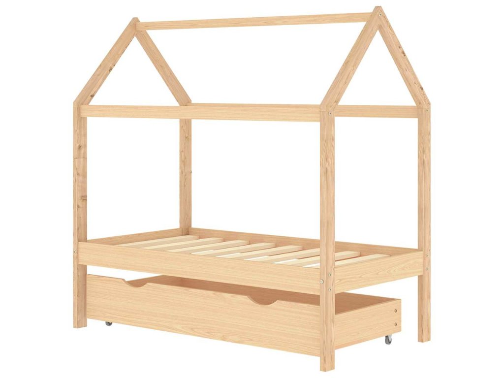 Posteľ je elegantne navrhnutá s rámom v štýle domčeka na strome, do ktorého môžete zavesiť závesy a vytvoriť tak súkromie pre svoje dieťa. Dá sa tiež použiť ako domček na na čítanie kníh alebo hranie pre vaše dieťa. Rám postele je vyrobený z masívneho borovicového dreva a je mimoriadne pevný a odolný. Silné lamely ponúkajú potrebnú oporu a sú veľmi pohodlné. Priložená zásuvka postele s 2 držadlami poskytuje dostatok úložného priestoru na uloženie zloženého oblečenia, hračiek atď., vďaka čomu bude vaša izba čistá a uprataná. Ľahko pohyblivé kolesá fungujú na podlahách s kobercom aj na drevenej podlahe. Tento rám postele je vhodný pre matrac s rozmermi 70 x 140 cm.