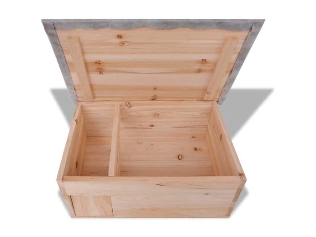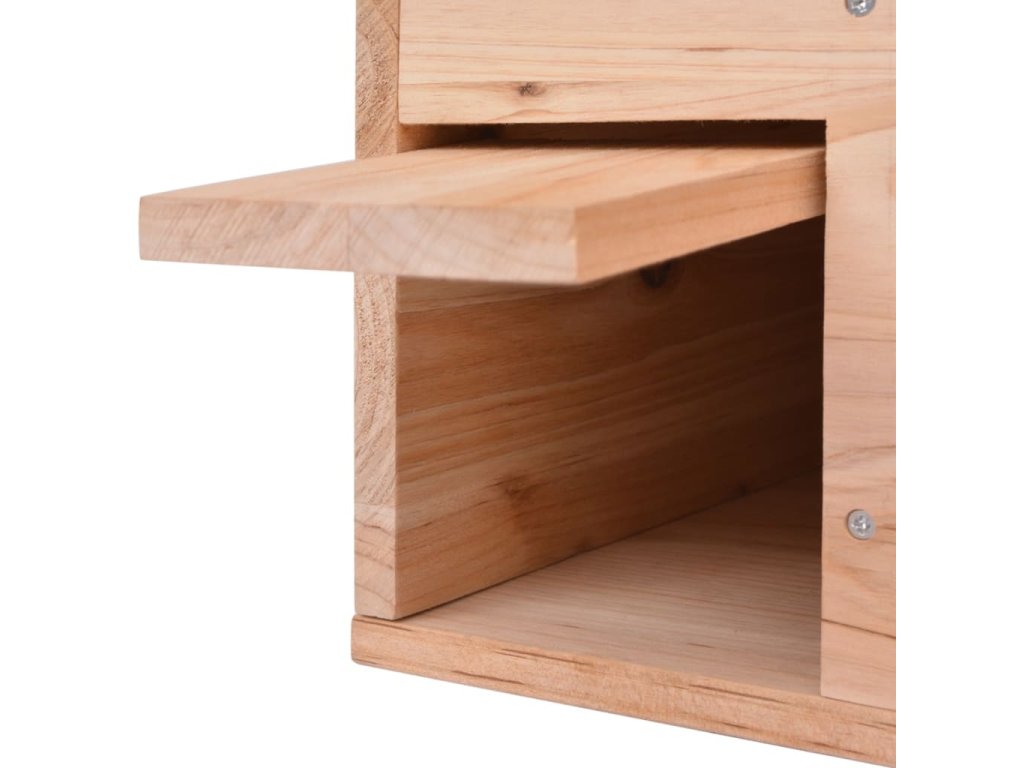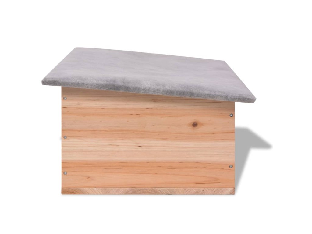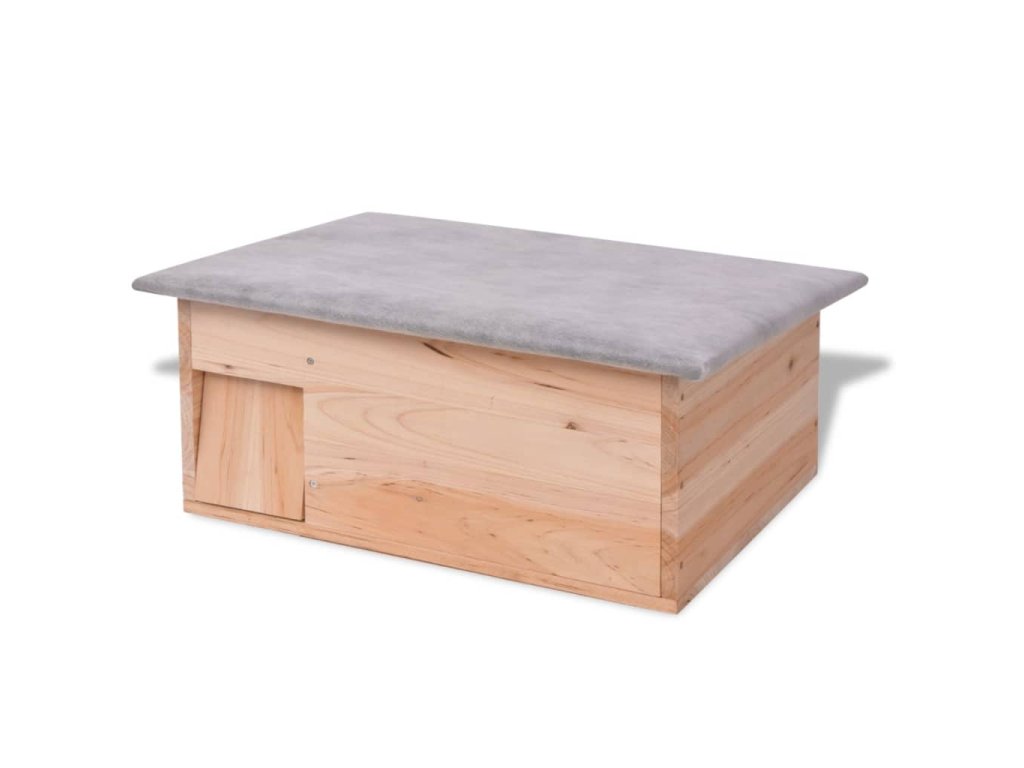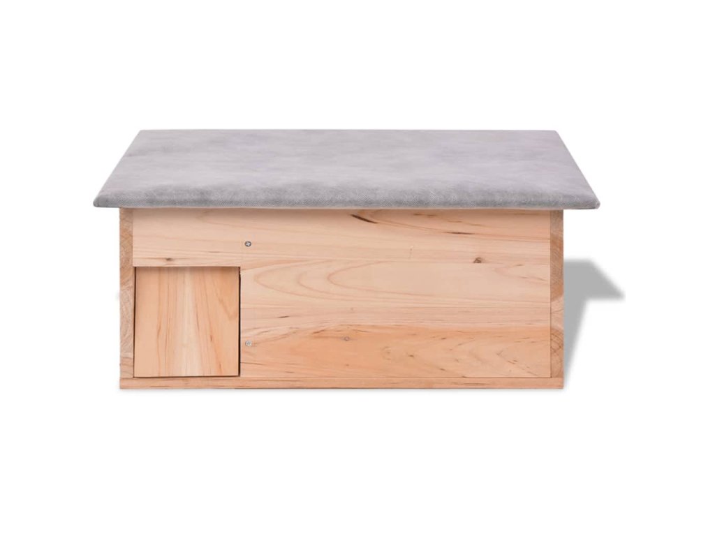Tento dom pre ježkov, ktorý je vyrobený z pevného čínskeho jedľového dreva a vybavený vodeodolnou strechou z polyesterovej tkaniny, je robustný a odolný voči vplyvom počasia. Dom má bezpečný labyrintový vchod, ktorý zabraňuje tomu, aby sa dostali dnu mačky. Strecha môže byť zdvihnutá, vďaka čomu sa vnútro domčeka ľahko čistí.
