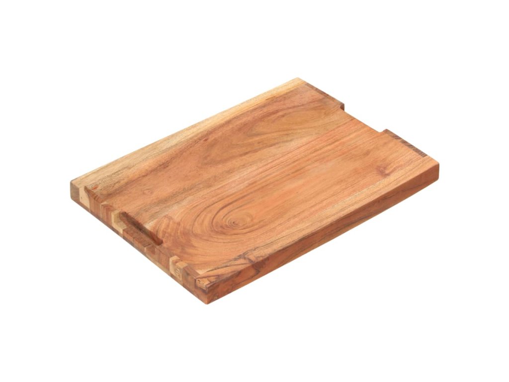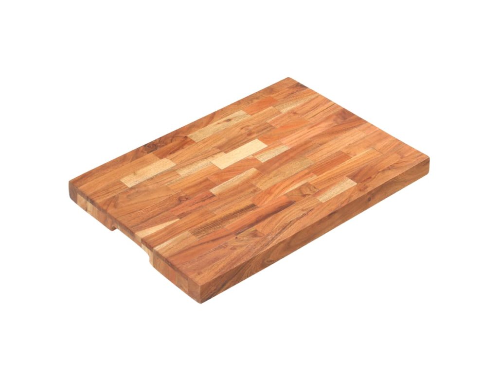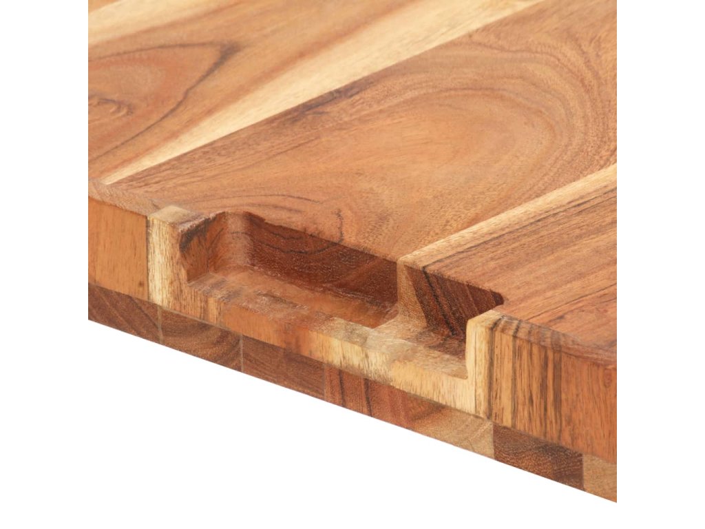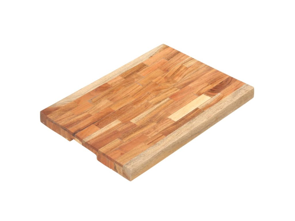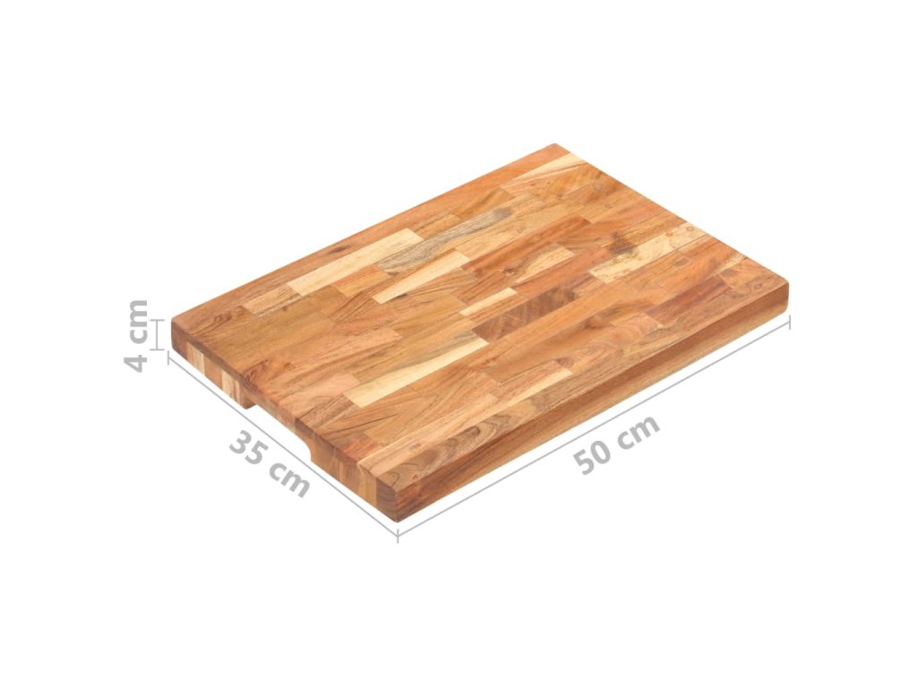 Naša doska s hrúbkou 4 cm vám poskytne pevný povrch na krájanie bylín, zeleniny, mäsa alebo rýb profesionálnym spôsobom! Je vyrobená z masívneho akáciového dreva, čo je tropické tvrdé drevo. Vďaka svojmu remeselnému spracovaniu a krásnej drevenej štruktúre je každá doska na krájanie mierne odlišná od inej dosky. Môžete ju ľahko podvihnúť pomocou drážky pre prsty.