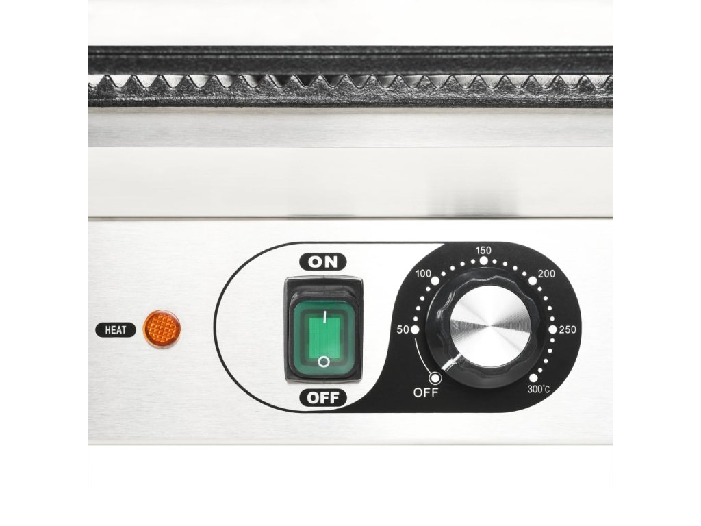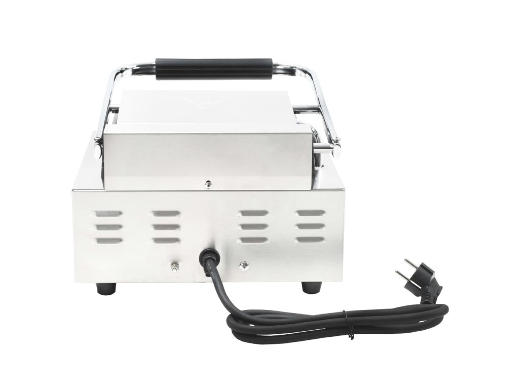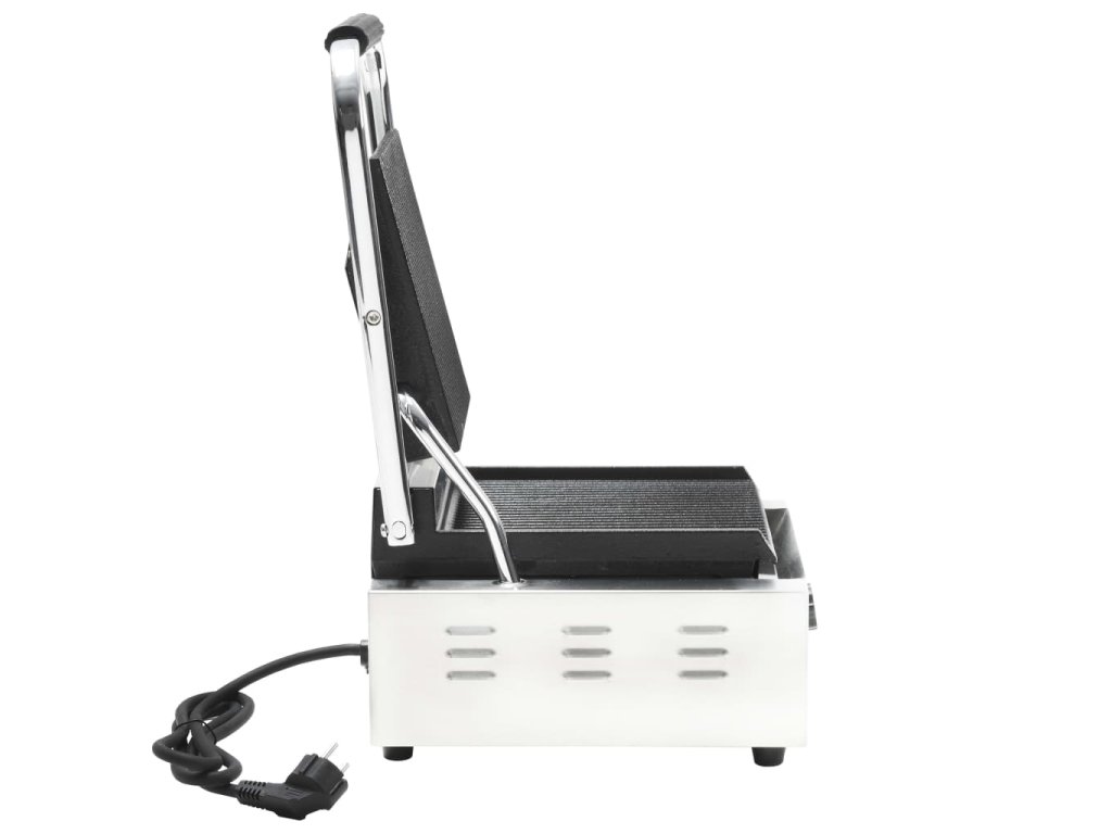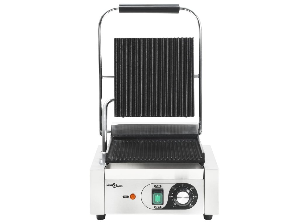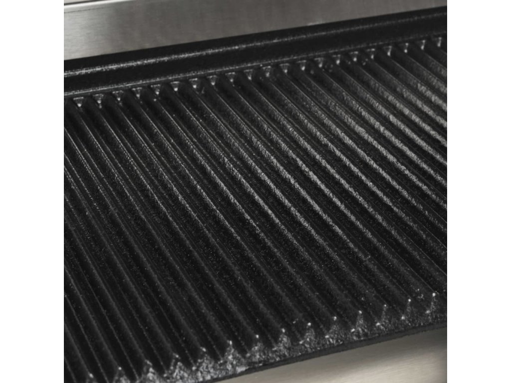 Tento kontaktný gril má odolné telo z nehrdzavejúcej ocele, vďaka ktorej gril dobre vyzerá, je odolný a jednoducho sa čistí. Má drážkované liatinové dosky pre rovnomernú distribúciu tepla a rýchle grilovanie. Gril je vybavený regulátorom teploty pre nastavenie vyhrievania na nízky, stredný alebo vysoký stupeň. Platnička má odkvapkávací podnos pre zber prebytočnej mastnoty a dá sa ľahko vybrať pre jednoduché čistenie. Súčasťou balenia je aj čistiaca kefa.