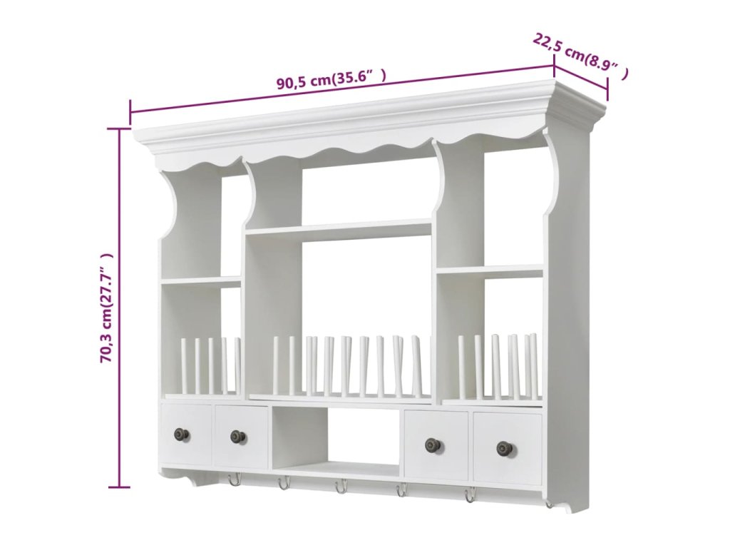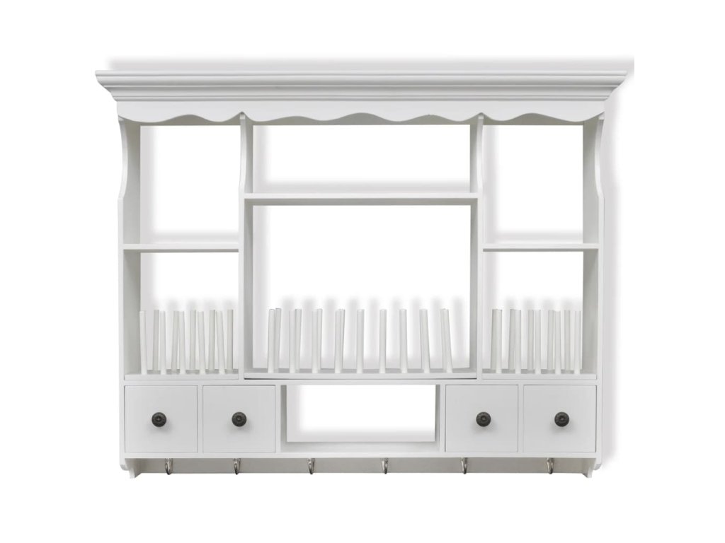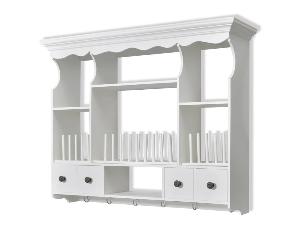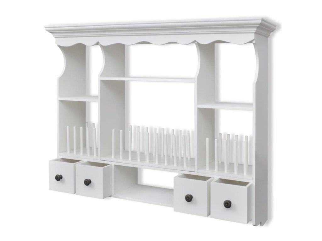 Skrinka má štyri zásuvky a štyri police, a tak si do nej môžete odkladať cereálie, korenia, pochutiny, konzervy či iné potraviny. Kolíky udržia taniere na mieste. Zásuvky sa ľahko otvárajú, aby ste si rýchlo mohli vybrať, čo potrebujete. Skrinka je vybavená aj háčikmi na zavesenie hrnčekov alebo utierok.