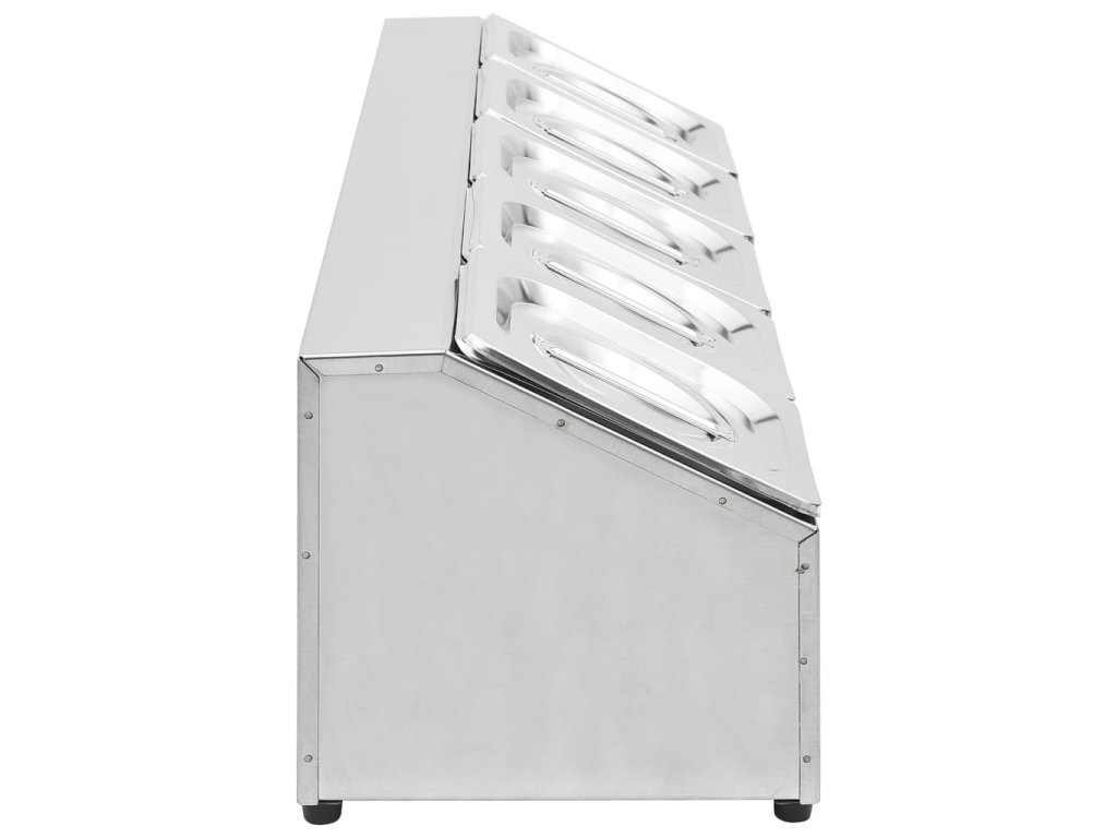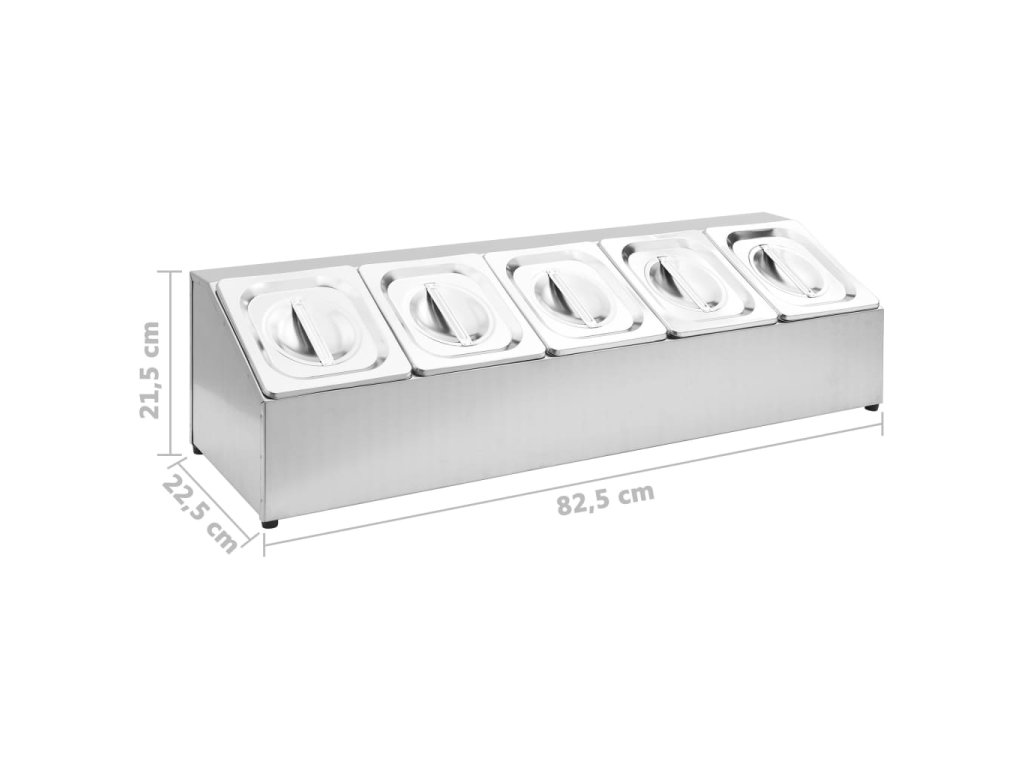 Táto nadstavba, vyrobená z nehrdzavejúcej ocele, je vhodná do umývačky riadu a ľahko sa čistí. Protišmykové gumené nožičky zaručujú stabilitu a chránia pracovnú plochu pred poškriabaním. Obsahuje aj 5 nádob GN 1/6, ktoré je možné odobrať pre ľahké plnenie a vyprázdňovanie. V balení sa nachádzajú aj zodpovedajúce viečka, aby bol obsah čerstvý, bezpečný a aby do neho nalietaval hmyz.