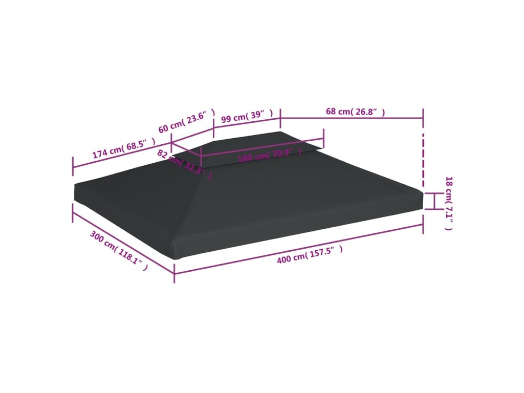 Tento náhradný baldachýn je vyrobený z trvácnej polyesterovej látky s vrstvou PVC, vďaka čomu je vodovzdorný. Strieška na altánok poskytuje ochranu pred horúcim slnkom, silným dažďom a inými nepriaznivými poveternostnými vplyvmi. Pre vlastnú bezpečnosť však dbajte na to, aby sa na strieške nezhromažďovala dažďová voda. Strieška má vystužené rohy pre dlhšiu trvácnosť.