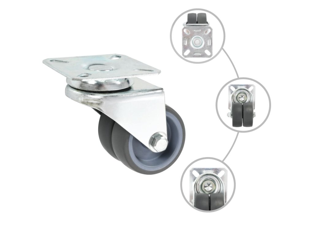 Táto sada obsahuje 12 dvojitých otočných koliesok a predstavuje praktický doplnok k menším nástrojom alebo k nábytku, ako napríklad k pracovným stolom, vozíkom, konferenčným stolíkom, stojanom na kvety, knižniciam, nákupným vozíkom a podobne.
