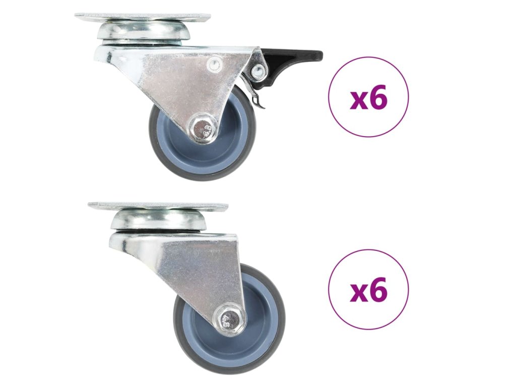 V balení sa nachádza 6 otočných koliesok a 6 otočných koliesok s brzdou.
