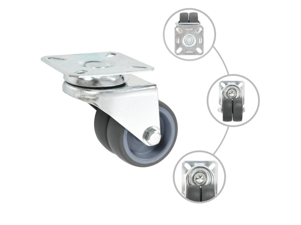 Táto sada obsahuje 16 dvojitých otočných koliesok a predstavuje praktický doplnok k menším nástrojom alebo k nábytku, ako napríklad k pracovným stolom, vozíkom, konferenčným stolíkom, stojanom na kvety, knižniciam, nákupným vozíkom a podobne.