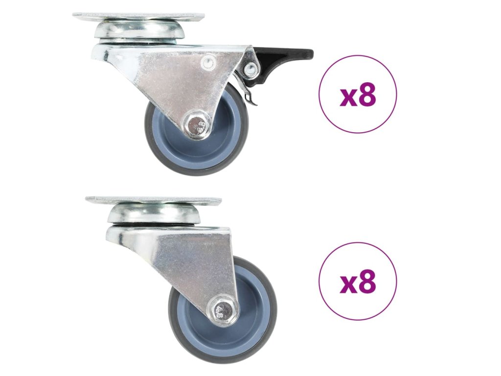V balení sa nachádza 8 otočných koliesok a 8 otočných koliesok s brzdou.