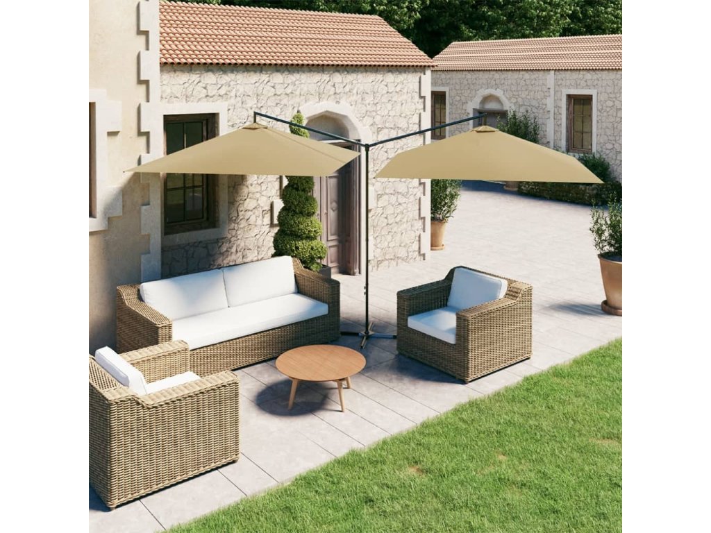 Tento slnečník je vyrobený z polyesteru, ktorý vám poskytne optimálnu ochranu, aby ste sa na slnku nespálili. Robustná oceľová tyč spolu s pevnými oceľovými rebrami slnečníku prináša potrebnú stabilitu. Slnečník má oceľový podstavec v tvare kríža pre lepšiu stabilitu. Má dizajn s dvoma strieškami vedľa seba, vďaka čomu je skutočne praktický, elegantný a jedinečný, takže vám poskytne ešte väčší tieň a zároveň predstavuje pôsobivý doplnok do každého vonkajšieho priestoru. Slnečník sa navyše jednoducho otvára aj zatvára.