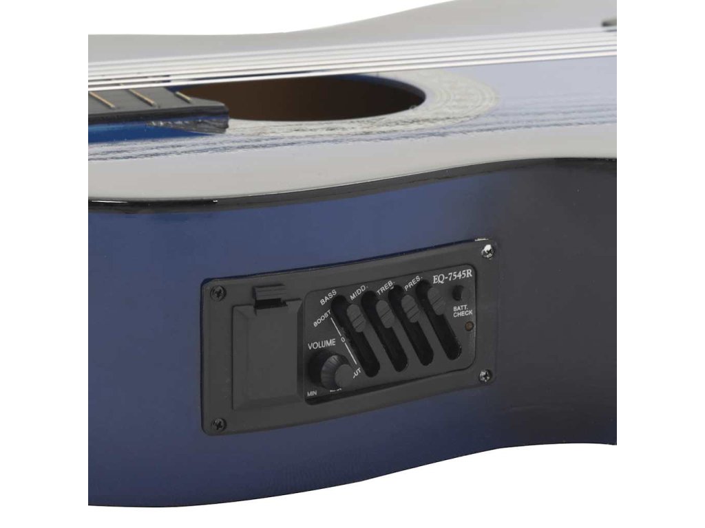 Gitara je vyrobená z lipového masívu s pevnými plastovými tlačidlami a hmatníkom. Má 6 strún a 4-pásmový EQ (ekvalizér). 4-pásmový EQ (ekvalizér) má funkciu ladenia gitarového tónu po pripojení k reproduktorovej skrini. Hodnota tejto gitary spočíva vo vynikajúcej kvalite zvuku a krásnom dizajne. Táto gitara so 65 cm hmatníkom má všetko, čo potrebujete, aby ste sa mohli stať gitaristom.