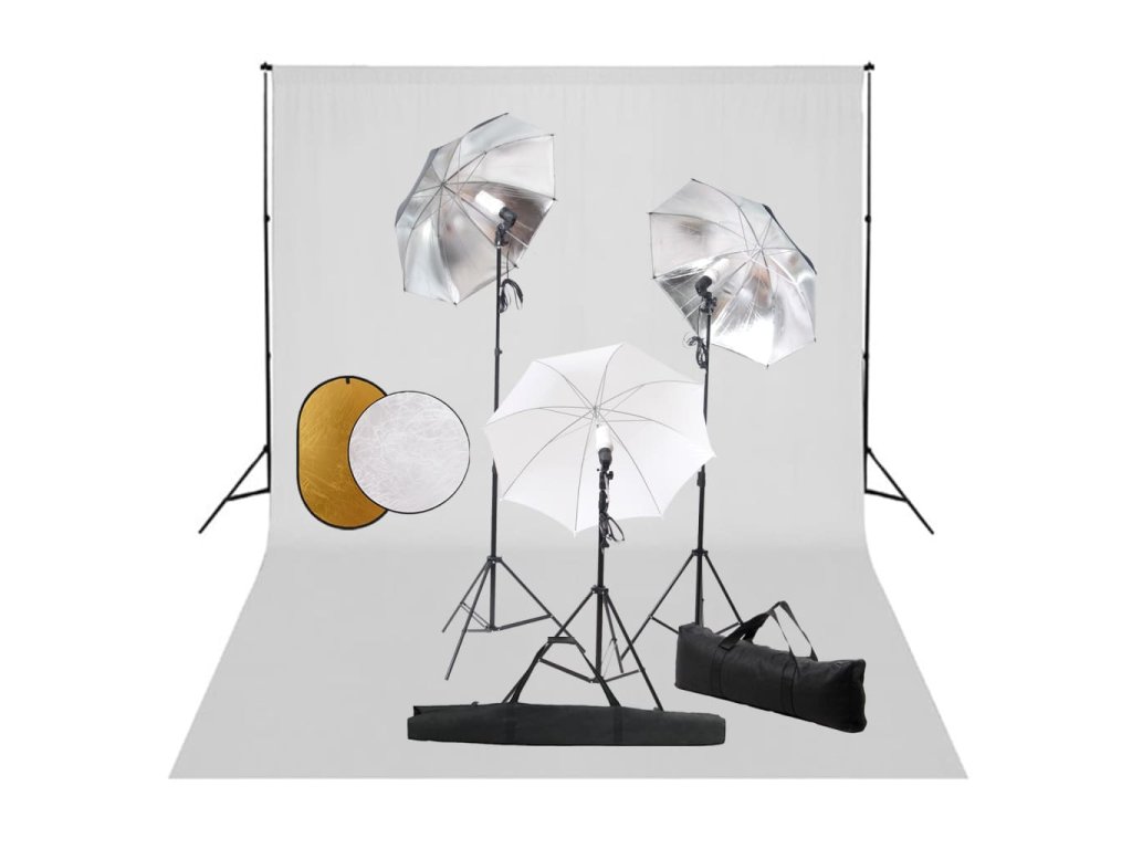 Teleskopický systém pozadia je nastaviteľný na šírku a výšku, aby vyhovoval vašim potrebám. V kombinácii s pozadím je ideálny na fotografovanie a filmovanie. Použitím žiaroviek denného svetla s farebnou teplotou 5500 Kelvinov je sada osvetlenia schopná zachytiť predmet prirodzeným spôsobom. Lampu môžete pripevniť na statív a dosiahnuť maximálnu výšku 230 cm. Dva biele dáždniky poskytujú mäkké svetlo, takže sa vyhnete výrazným tieňom. Statív má navyše štandardný 1/4" závit pre všetky analógové a digitálne fotoaparáty. Sada reflektorov obsahuje okrúhly reflektor 5 v 1 a elipsový reflektor 2 v 1. Každý reflektor je dodávaný s rôznymi povrchovými panelmi. Môže pracovať s rôznymi kombináciami pre teplejšie alebo chladnejšie svetlá. S pribalený prenosným vakom sa štúdiová súprava ľahko skladuje a prepravuje.
