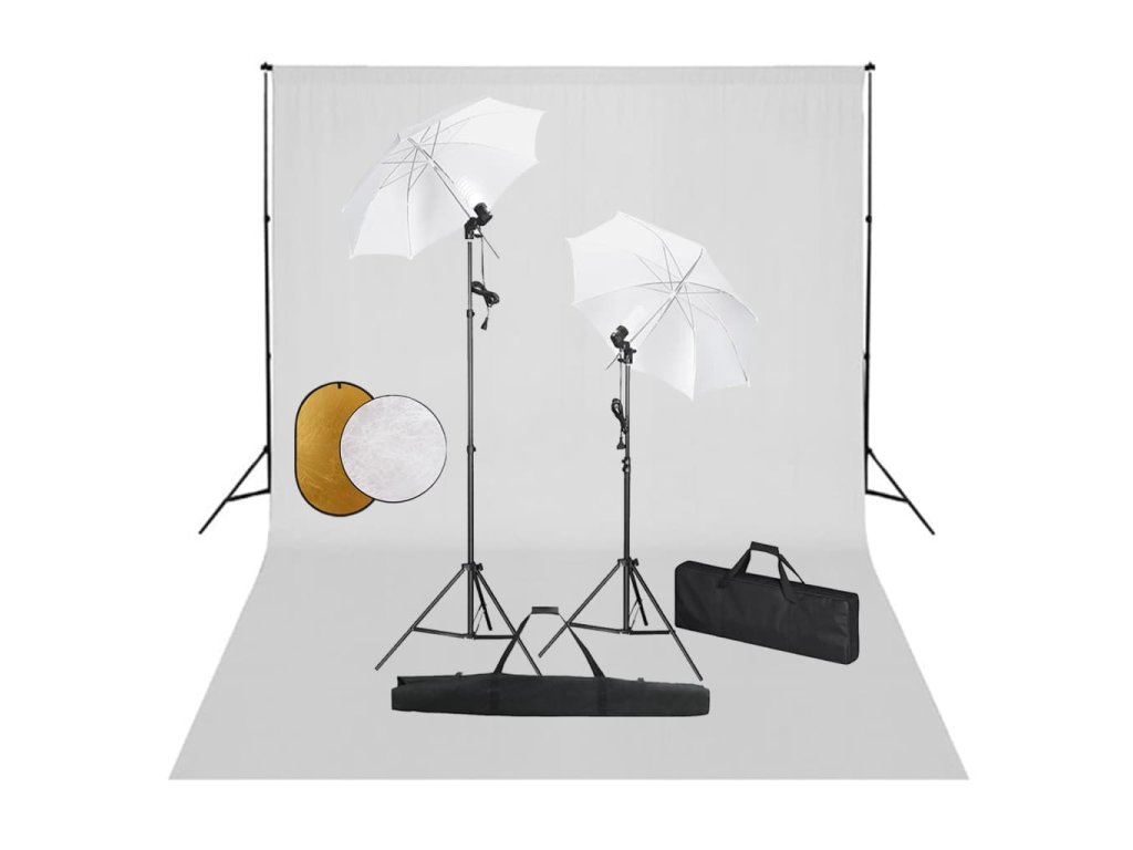Teleskopický systém pozadia je nastaviteľný na šírku a výšku, aby vyhovoval vašim potrebám. V kombinácii s pozadím je ideálny na fotografovanie a filmovanie. Použitím žiaroviek denného svetla s farebnou teplotou 5500 Kelvinov je sada osvetlenia schopná zachytiť predmet prirodzeným spôsobom. Lampu môžete pripevniť na statív a dosiahnuť maximálnu výšku 230 cm. Dva biele dáždniky poskytujú mäkké svetlo, takže sa vyhnete výrazným tieňom. Statív má navyše štandardný 1/4" závit pre všetky analógové a digitálne fotoaparáty. Sada reflektorov obsahuje okrúhly reflektor 5 v 1 a elipsový reflektor 2 v 1. Každý reflektor je dodávaný s rôznymi povrchovými panelmi. Môže pracovať s rôznymi kombináciami pre teplejšie alebo chladnejšie svetlá. S pribalený prenosným vakom sa štúdiová súprava ľahko skladuje a prepravuje.