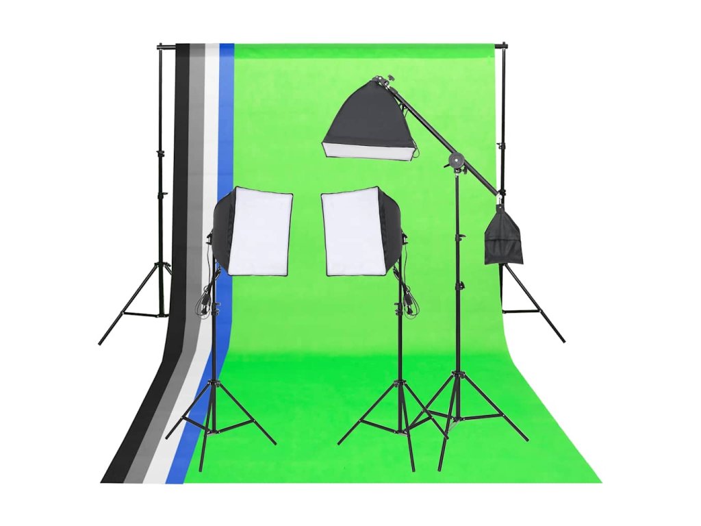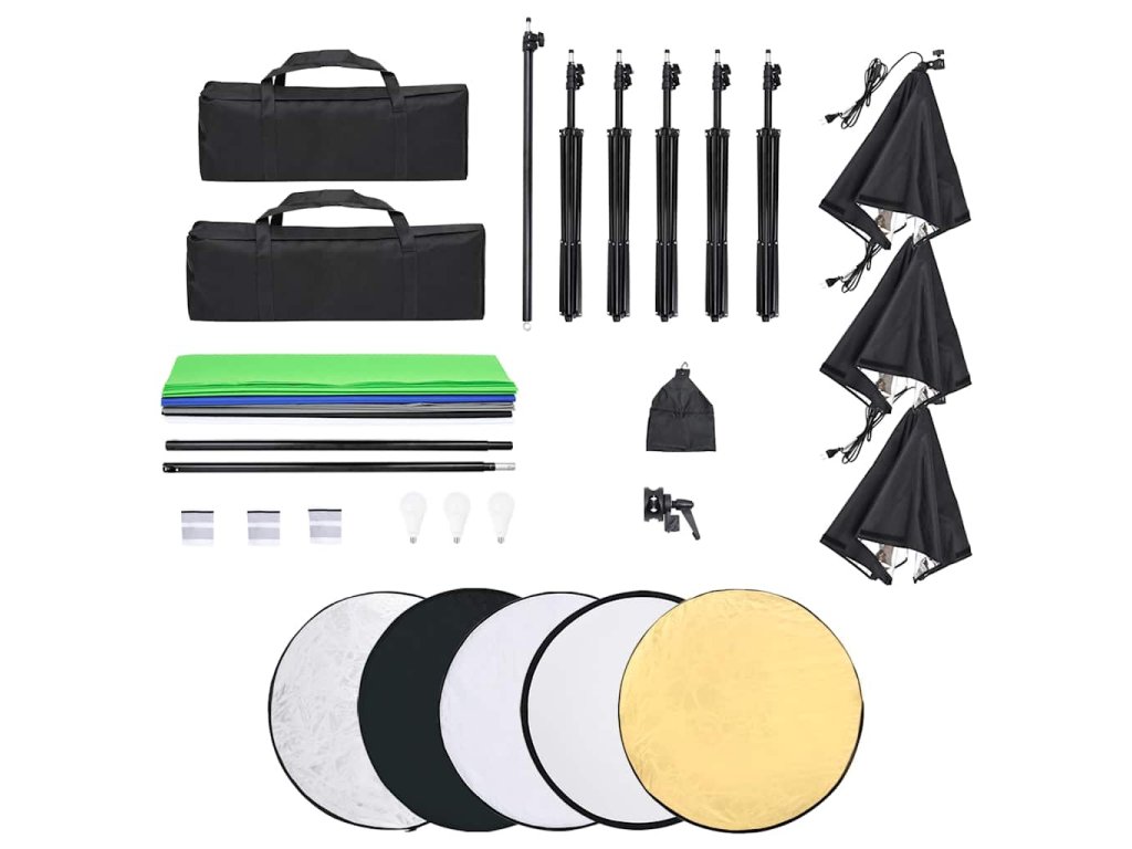 Táto sada do fotoštúdia, ktorá obsahuje farebné pozadia a softboxový osvetľovací systém a reflektor 5-v-1, môže byť použitá na fotografovanie v štúdiu alebo mimo štúdia.