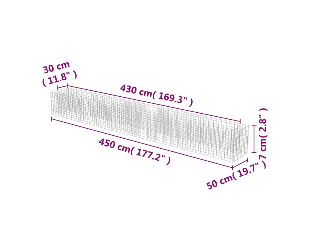 Stabilný gabión je určený na to, aby sa do neho vložili kamene alebo štrk. Gabión je vyrobený z pozinkovanej ocele, ktorá je odolná voči hrdzi a poveternostným vplyvom, vďaka čomu vytvorí veľmi stabilný a trvácny vyvýšený záhon. Mriežku tvoria priečne a pozdĺžne drôty, ktoré sú zvarené na každom prieseku pre čo najväčšiu stabilitu.
