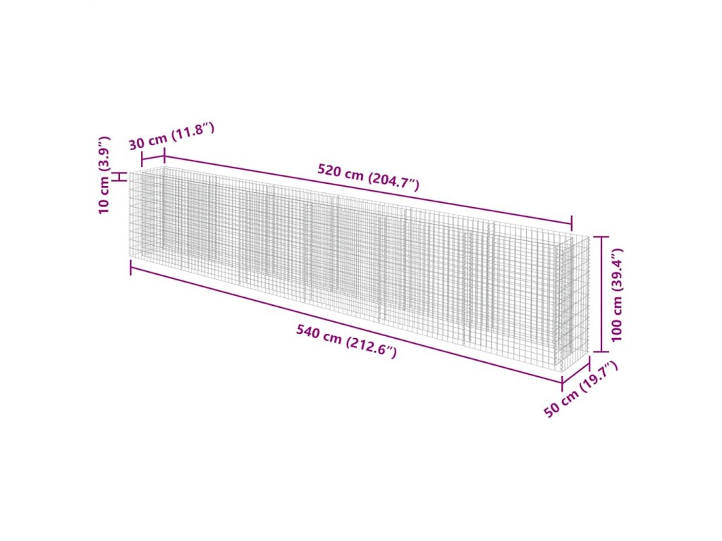 Stabilný gabión je určený na to, aby sa do neho vložili kamene alebo štrk. Gabión je vyrobený z pozinkovanej ocele, ktorá je odolná voči hrdzi a poveternostným vplyvom, vďaka čomu vytvorí veľmi stabilný a trvácny vyvýšený záhon. Mriežku tvoria priečne a pozdĺžne drôty, ktoré sú zvarené na každom prieseku pre čo najväčšiu stabilitu.