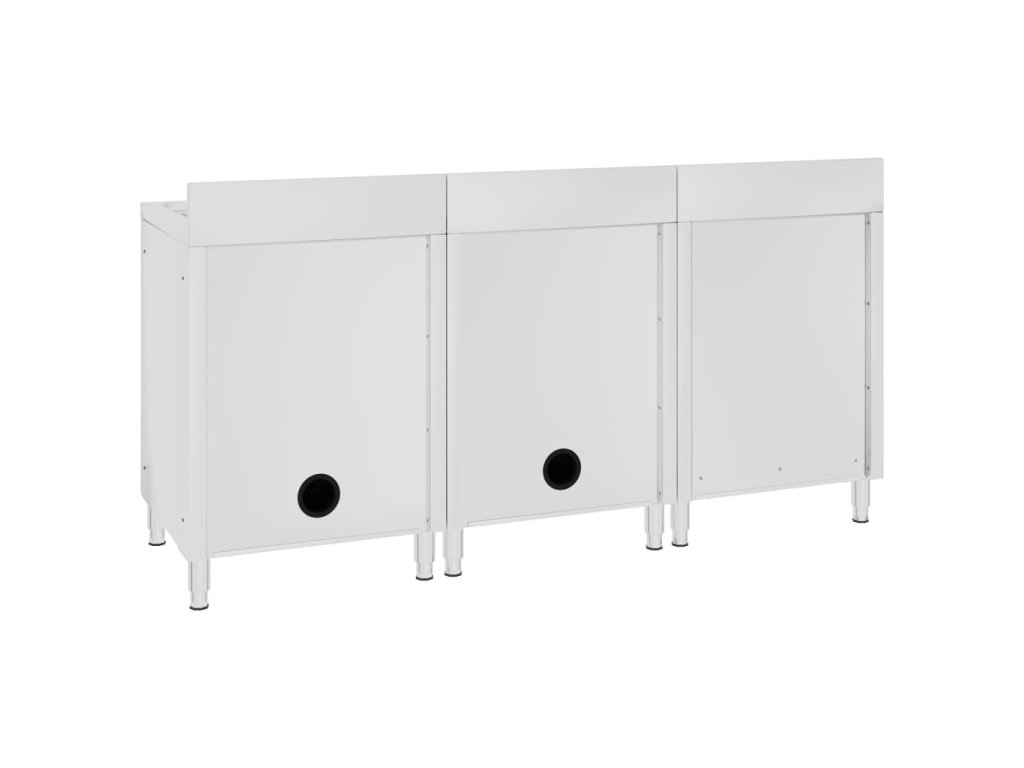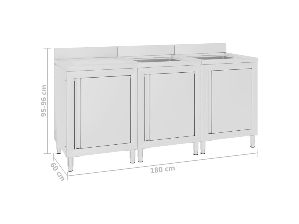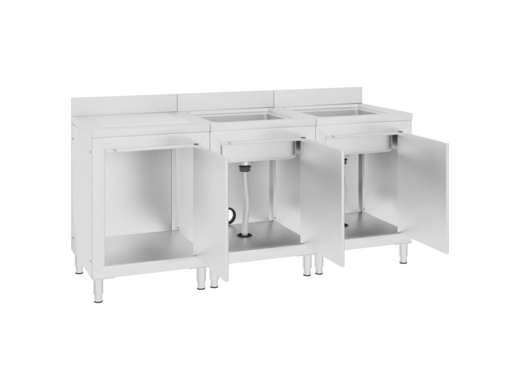 Táto sada skriniek je vyrobená z kvalitnej nehrdzavejúcej ocele, je robustná, antikorózna a ľahko sa čistí. Spodné skrinky poskytujú dostatok úložného priestoru pre čistiace prostriedky a príslušenstvo. Na odtokovej doske môžete sušiť príbory, taniere a hrnce, takže vám nebudú ostávať na doske kaluže vody. Nastaviteľné nožičky udržujú skrinku rovnú aj na nerovných podlahách. Obsahuje 10 cm zástenu a otvor na vodovodné potrubie.