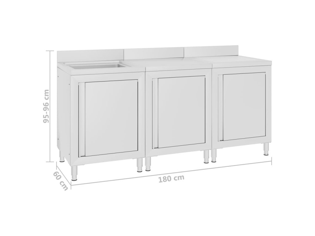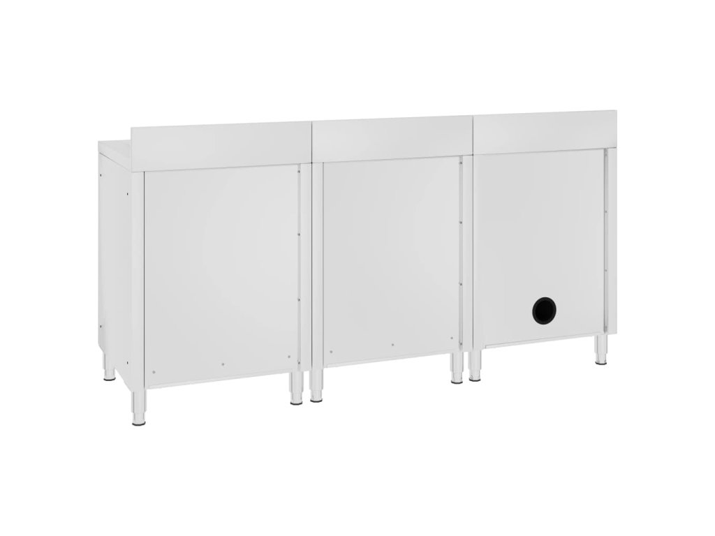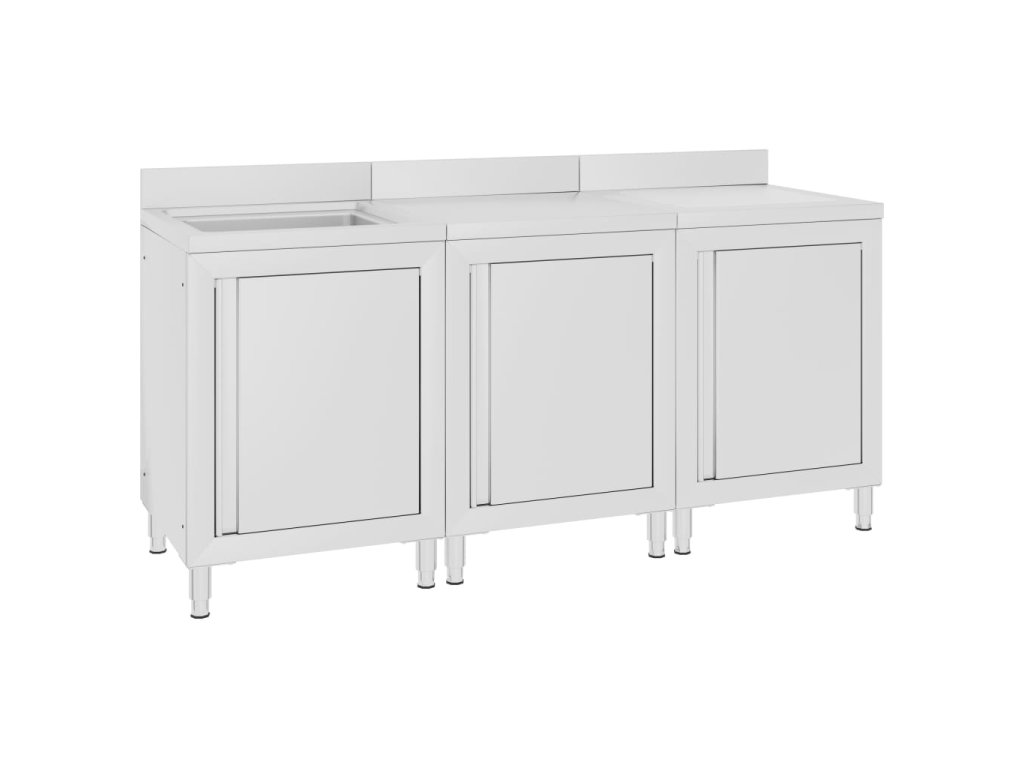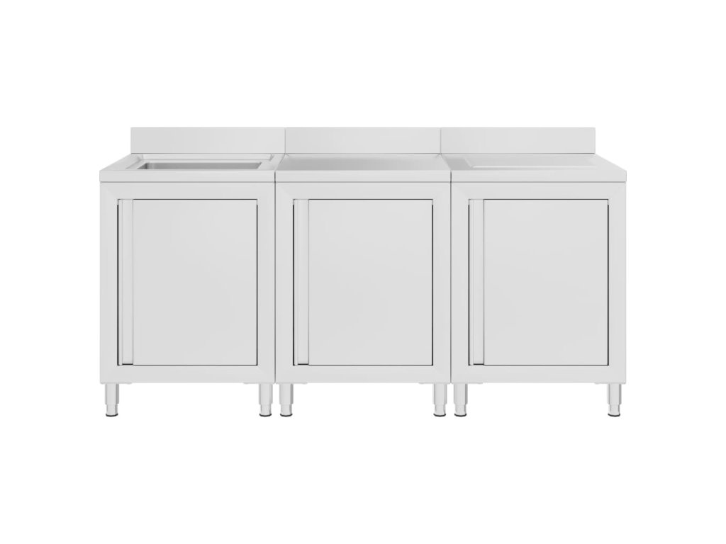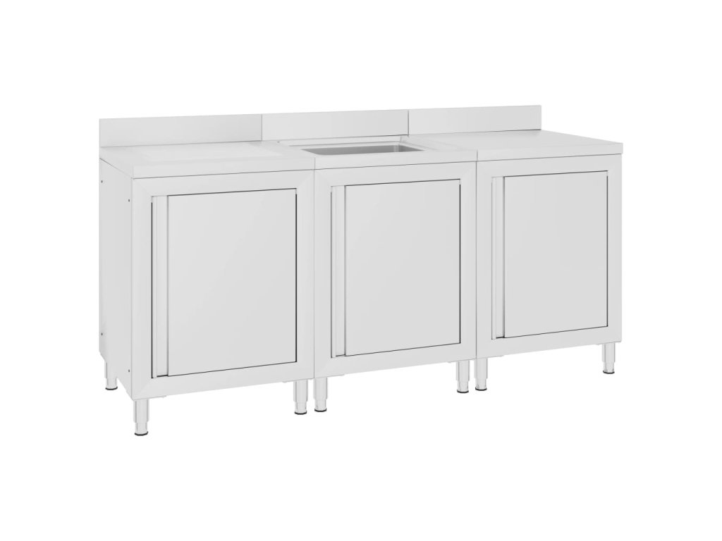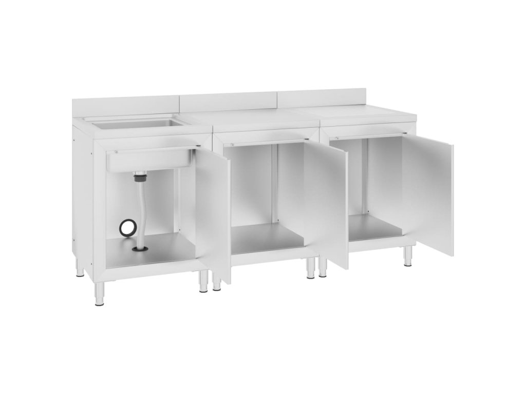 Táto sada skriniek je vyrobená z kvalitnej nehrdzavejúcej ocele, je robustná, antikorózna a ľahko sa čistí. Na odtokovej doske môžete sušiť príbory, taniere a hrnce, takže vám nebudú ostávať na doske kaluže vody. Spodné skrinky poskytujú dostatok úložného priestoru pre čistiace prostriedky a príslušenstvo. Nastaviteľné nožičky udržujú skrinku rovnú aj na nerovných podlahách. Obsahuje 10 cm zástenu a otvor na vodovodné potrubie.