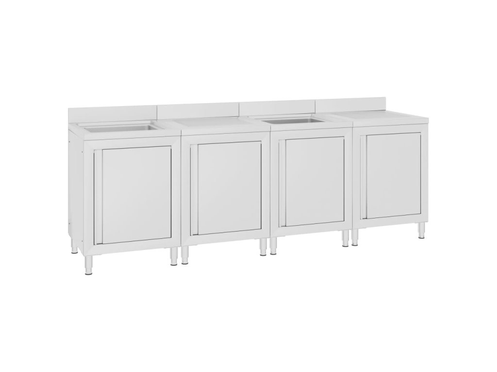 Táto sada skriniek je vyrobená z kvalitnej nehrdzavejúcej ocele, je robustná, antikorózna a ľahko sa čistí. Spodné skrinky poskytujú dostatok úložného priestoru pre čistiace prostriedky a príslušenstvo. Na odtokovej doske môžete sušiť príbory, taniere a hrnce, takže vám nebudú ostávať na doske kaluže vody. Nastaviteľné nožičky udržujú skrinku rovnú aj na nerovných podlahách. Obsahuje 10 cm zástenu a otvor na vodovodné potrubie.