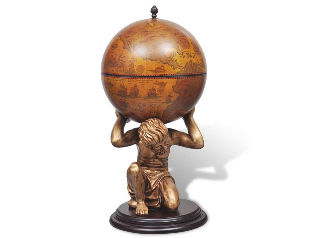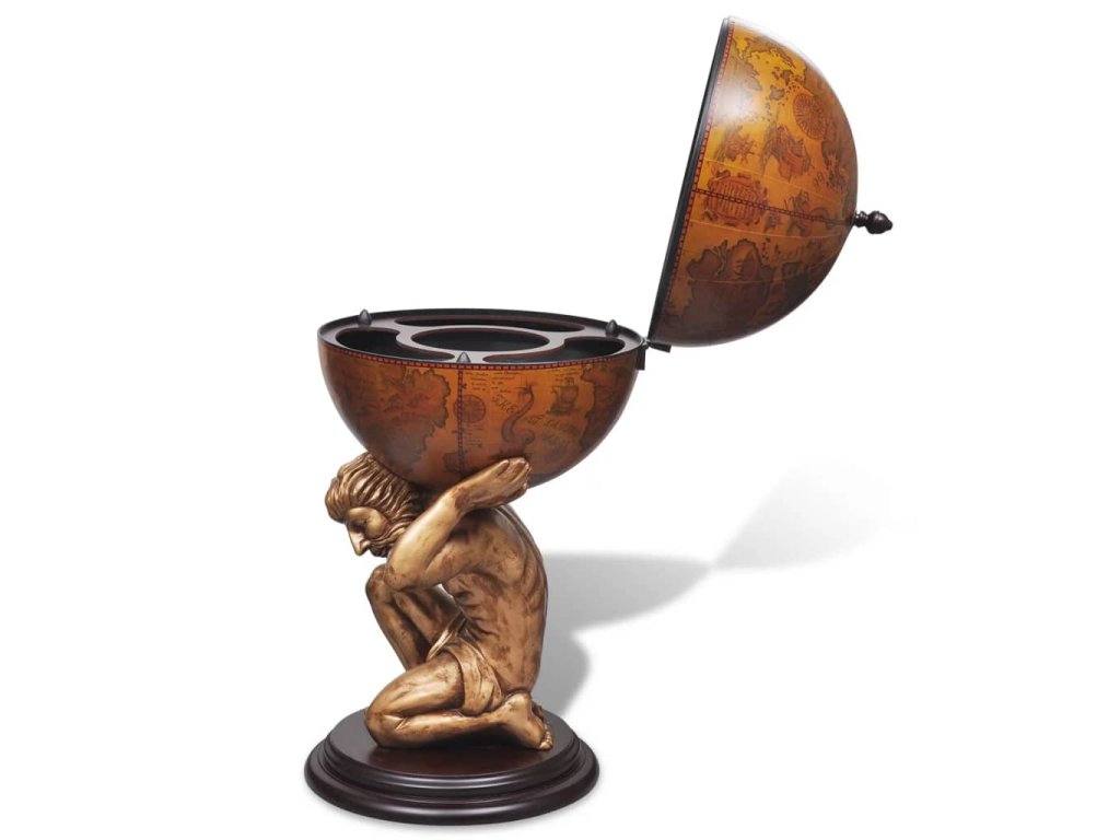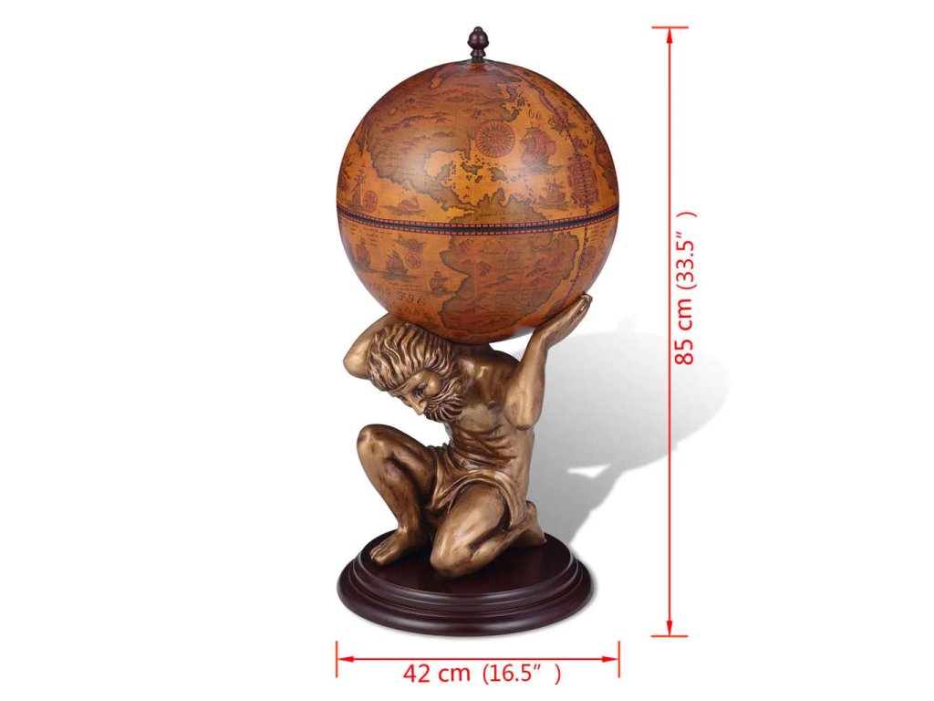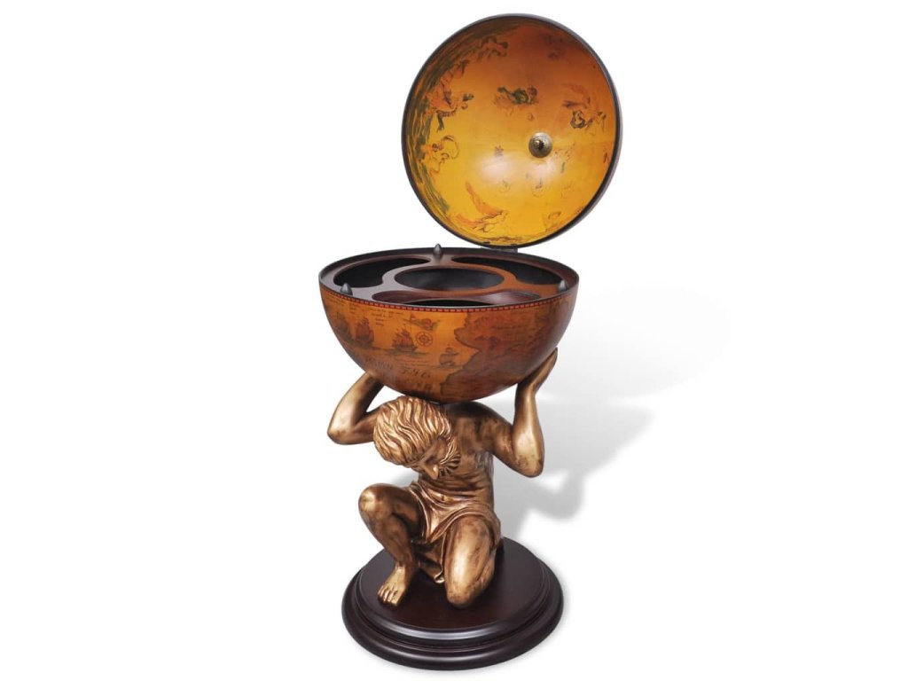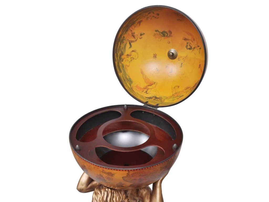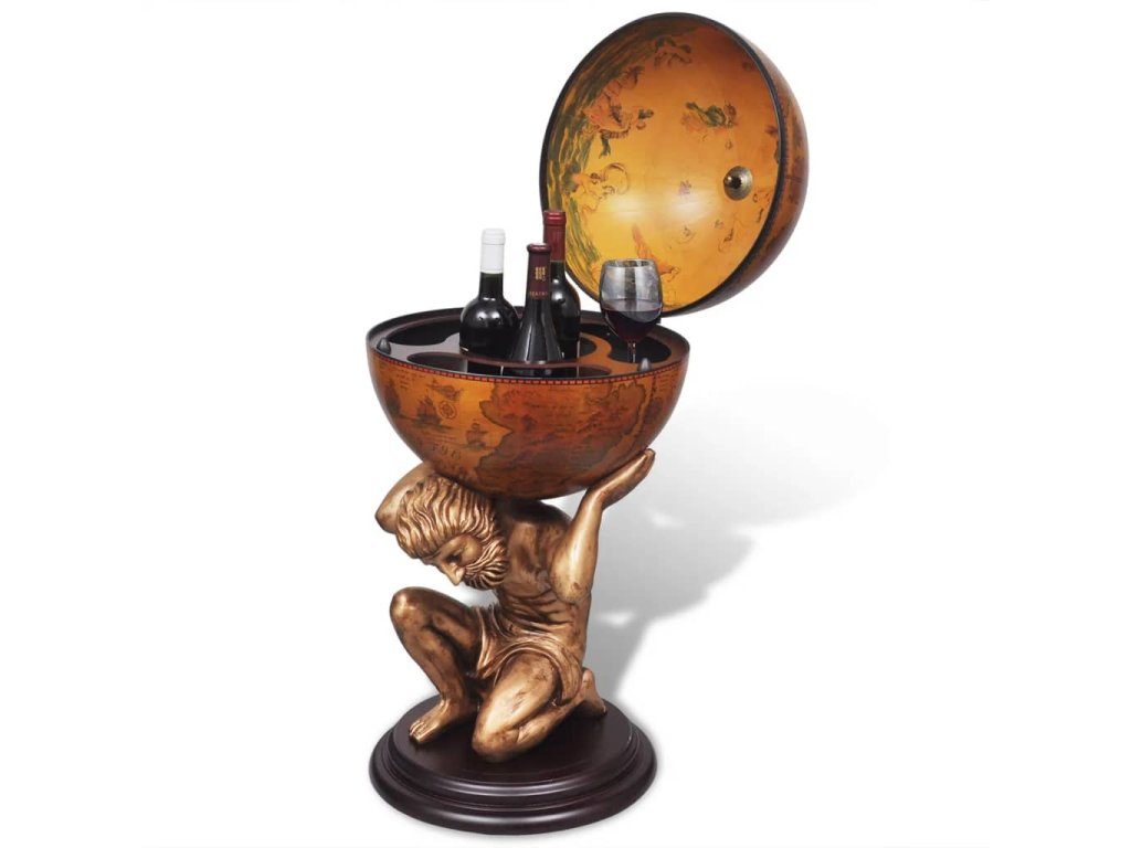 Glóbusový bar poskytuje ideálne miesto na odkladanie a usporiadanie niekoľkých fliaš a pohárov. Glóbus je zdobený starobylou mapou a stabilný podstavec je vyhotovený z trvácneho a kvalitného MDF. Bol vytvarovaný do podoby mytologickej postavy Atlasa. Tento glóbusový bar/skrinka na víno stelesňuje dokonalú kombináciu praktickosti a estetiky.