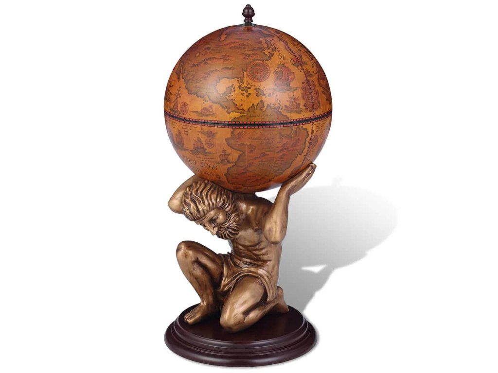 - S ozdobnou, starobylou mapou a podstavcom v podobe mytologickej postavy Atlasa