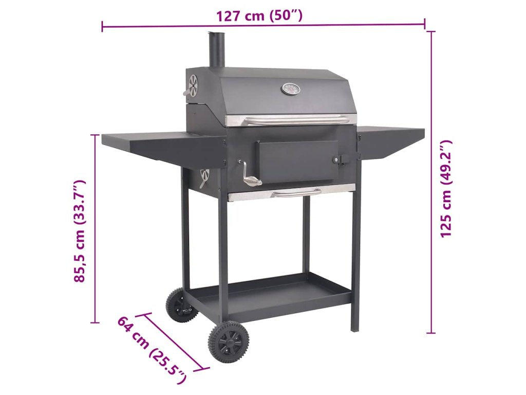 Náš gril má dokonale utesnené hrubé kovové telo, ktoré mu umožňuje výborné zachovanie a rozloženie tepla. Teplotu v komore môžete sledovať pomocou integrovaného teplomeru na digestore. Gril má aj dva bočné stoly, na ktoré môžete umiestniť korenie, ingrediencie, príbory a iné pomôcky na grilovanie. Na spodnú poličku môžete taktiež umiestniť položky, ktoré potrebujete mať na dosah ruky. Vďaka rukoväti z nehrdzavejúcej ocele je otvorenie komory bezpečné a pohodlné. Gril je vybavený dvoma kolieskami, takže sa dá ľahko premiestňovať napríklad na vonkajšie večierky, pikniky a iné udalosti.