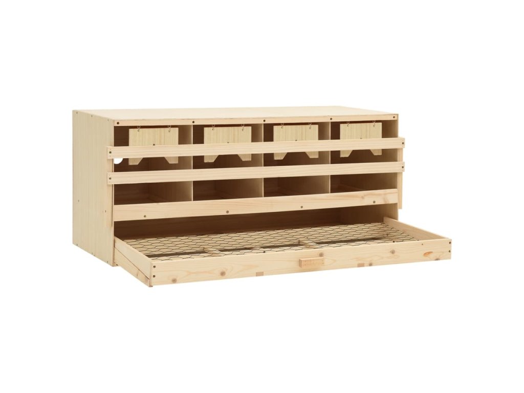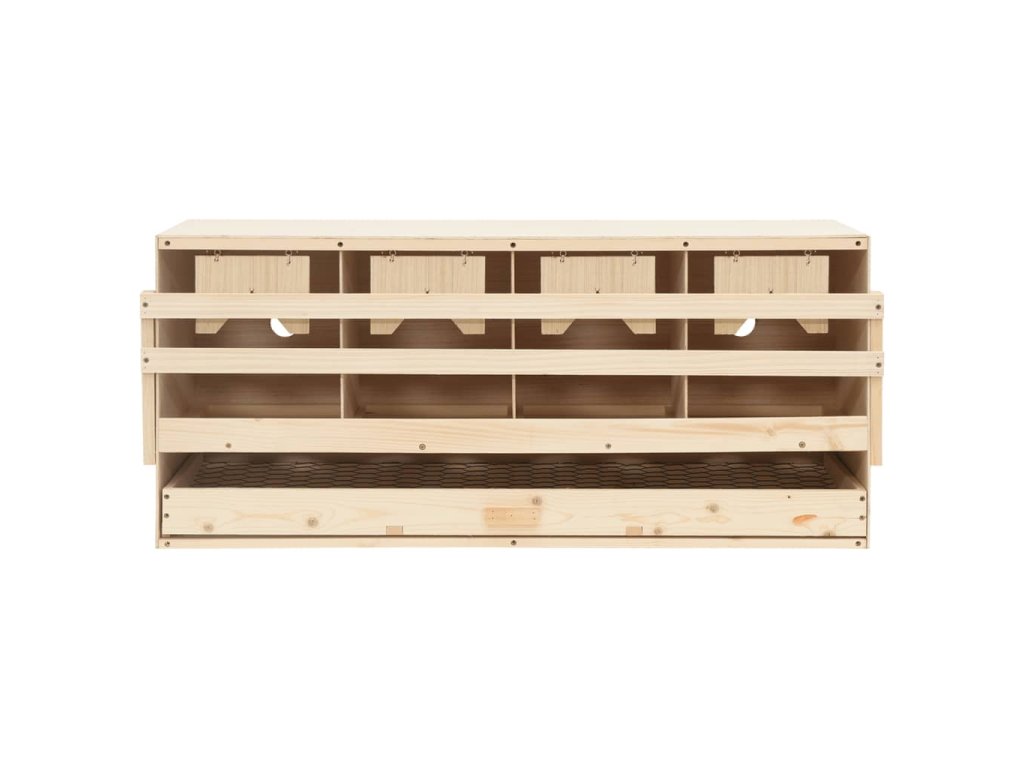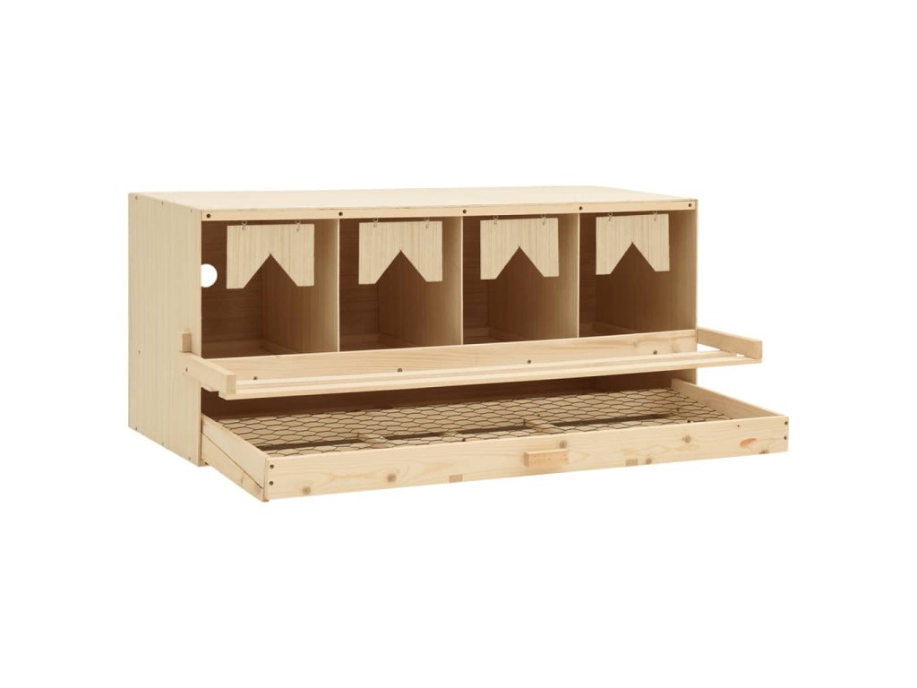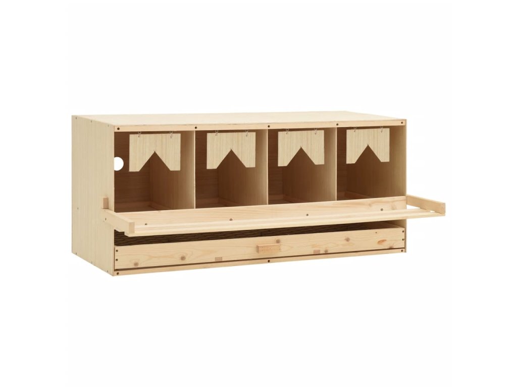 4 priestranné priečinky umožňujú 4 sliepkam v strednej veľkosti usadiť sa a znášať vajcia. Vajcia budú jemne padať cez otvory v podlahe do spodnej zásuvky, čo uľahčuje ich zber. Odnímateľná spodná vrstva umožňuje ľahké čistenie. Bidlá sa dajú sklopiť nahor, aby sa zabránilo nočnému spaniu na bidle. Rovná strecha sliepkam umožňuje sedenie na nej a tiež položenie viacerých búdok na seba. V našom obchode nájdete aj hniezdiace boxy so šikmou strechou.