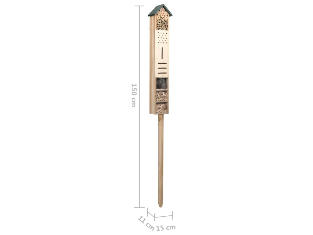Tento domček na hmyz sa skladá z masívneho jedľového dreva, ktoré je stabilné a trvácne. Prírodné šišky, duté bambusové stonky a hobliny sa používajú na obnovu skutočného prirodzeného prostredia a na prilákanie rôznych druhov, ako sú čmeliaky, včely medonosné, motýle a lienky, a ďalší hmyz, ktorý pomáha ničiť nežiaducich škodcov.