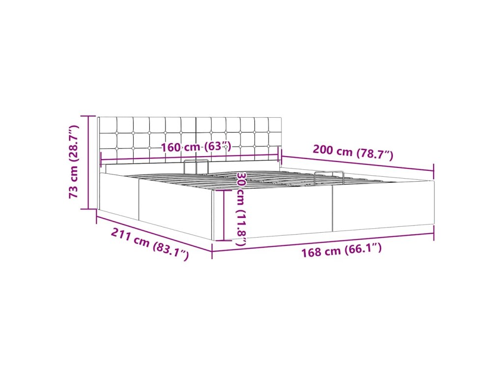 Oceľový rám s práškovou povrchovou úpravou a rošty z preglejky posteli dodávajú potrebnú pevnosť a odolnosť. Posteľ s úložným priestorom je potiahnutá príjemnou a trvácnou látkou, ktorá sa ľahko udržiava. Výrobok sa jednoducho montuje. Vhodné rozmery matraca na túto posteľ sú 160 x 200 cm.