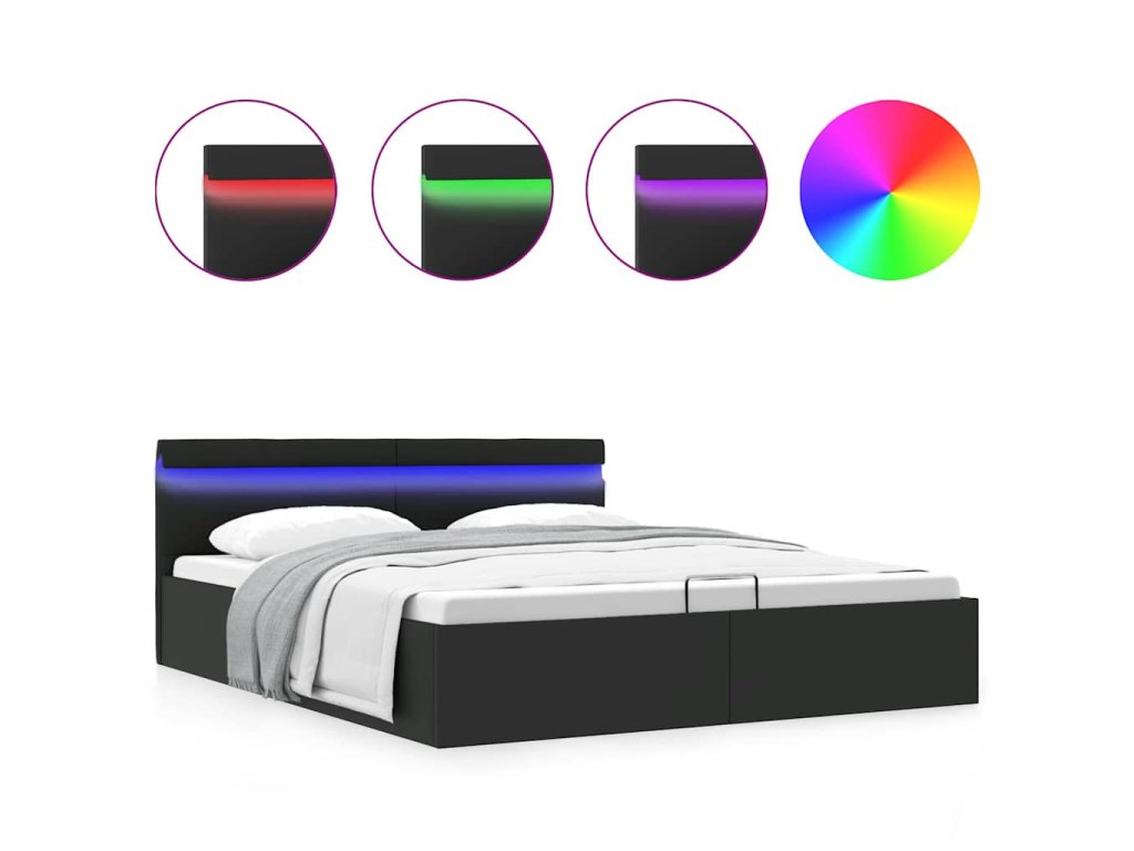 Oceľový rám s práškovou povrchovou úpravou a preglejkové lamely zvyšujú pevnosť a odolnosť postele. Táto úložná posteľ čalúnená lesklou umelou kožou vyzerá príťažlivo a ľahko sa udržiava. Tento nábytok do spálne je vhodný pre matrac s rozmermi 180 x 200 cm. Táto posteľ je vybavená svetlami LED, ktoré sa dajú jednoducho nastaviť a vytvoriť tak individuálnu svetelnú šou. Môžete si prispôsobiť režimy, farby a jas, aby ste zlepšili atmosféru svojho interiéru. Tento výrobok sa jednoducho montuje.