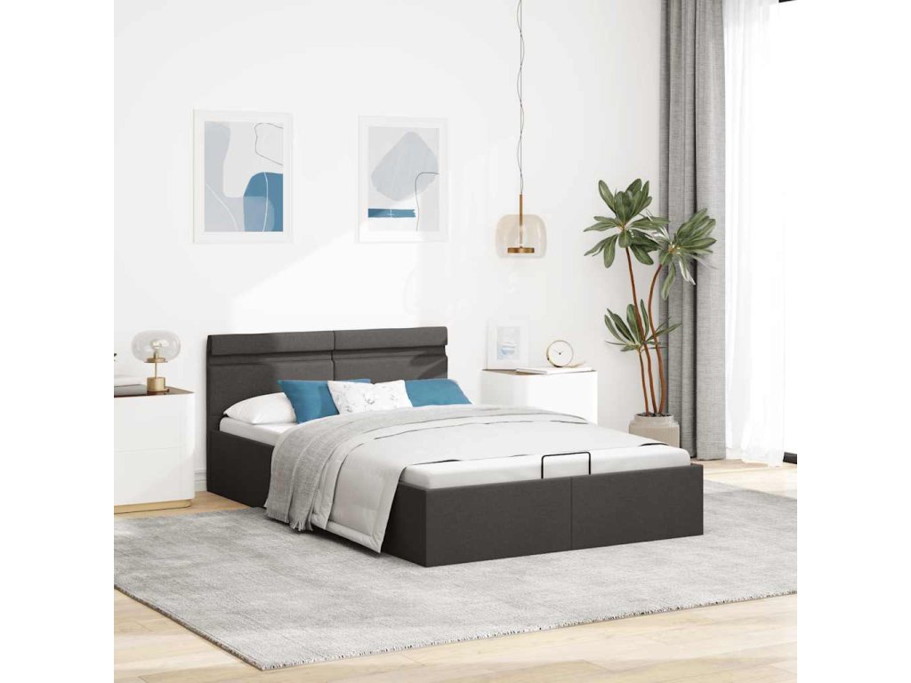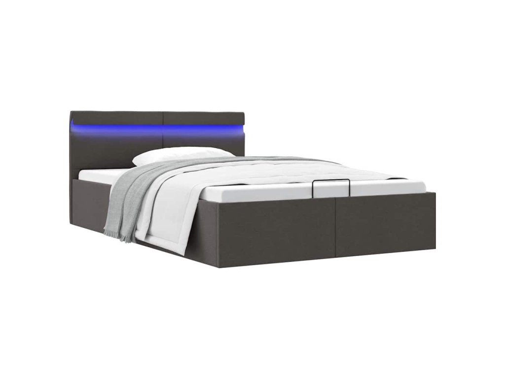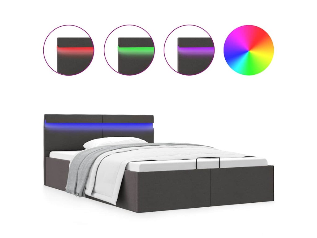 Oceľový rám s práškovou povrchovou úpravou a rošty z preglejky posteli dodávajú potrebnú pevnosť a odolnosť. Posteľ s úložným priestorom je potiahnutá príjemnou a trvácnou látkou, ktorá sa ľahko čistí. Výrobok sa jednoducho montuje. Vhodné rozmery matraca na túto posteľ sú 140 x 200 cm. Okrem toho môžete pohodlne nastavovať výkon, jas a rôzne blikajúce farby LED svetelného pásika pomocou diaľkového ovládania a vytvoriť ohromujúcu svetelnú show.