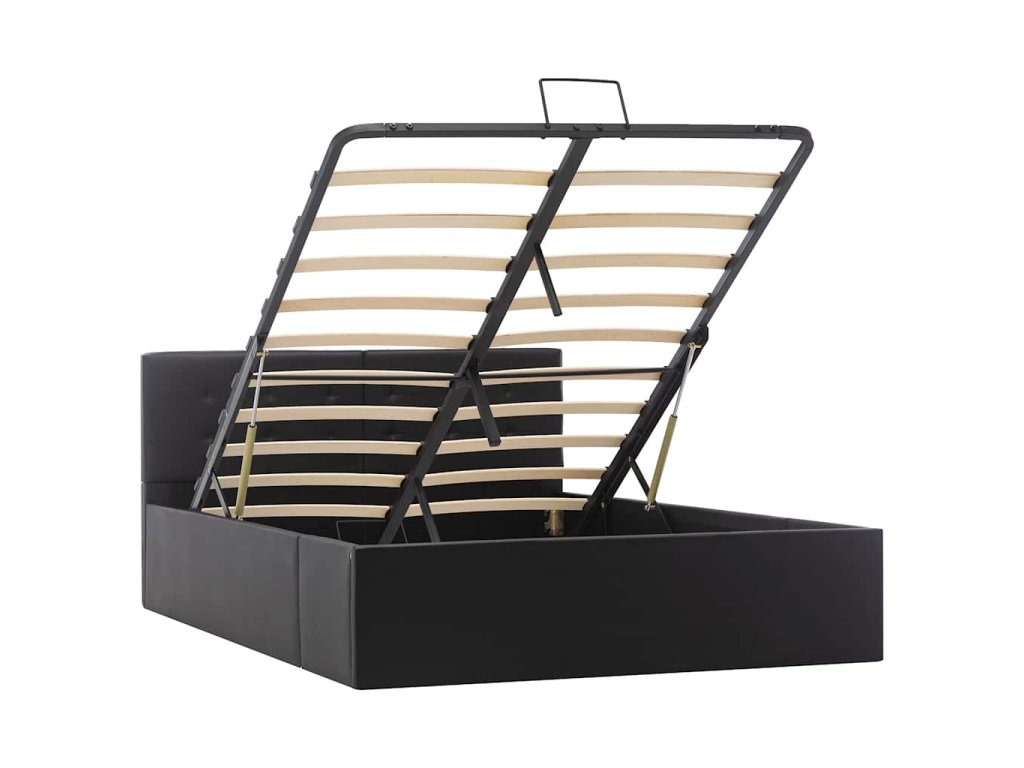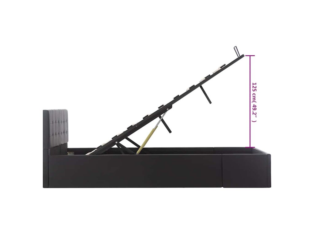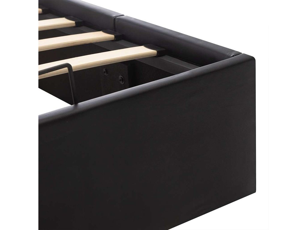 Oceľový rám s práškovou povrchovou úpravou a rošty z preglejky posteli dodávajú potrebnú pevnosť a odolnosť. Posteľ s úložným priestorom je potiahnutá lesklou umelou kožou, ktorá sa ľahko udržiava. Výrobok sa jednoducho montuje. Vhodné rozmery matraca na túto posteľ sú 120 x 200 cm.