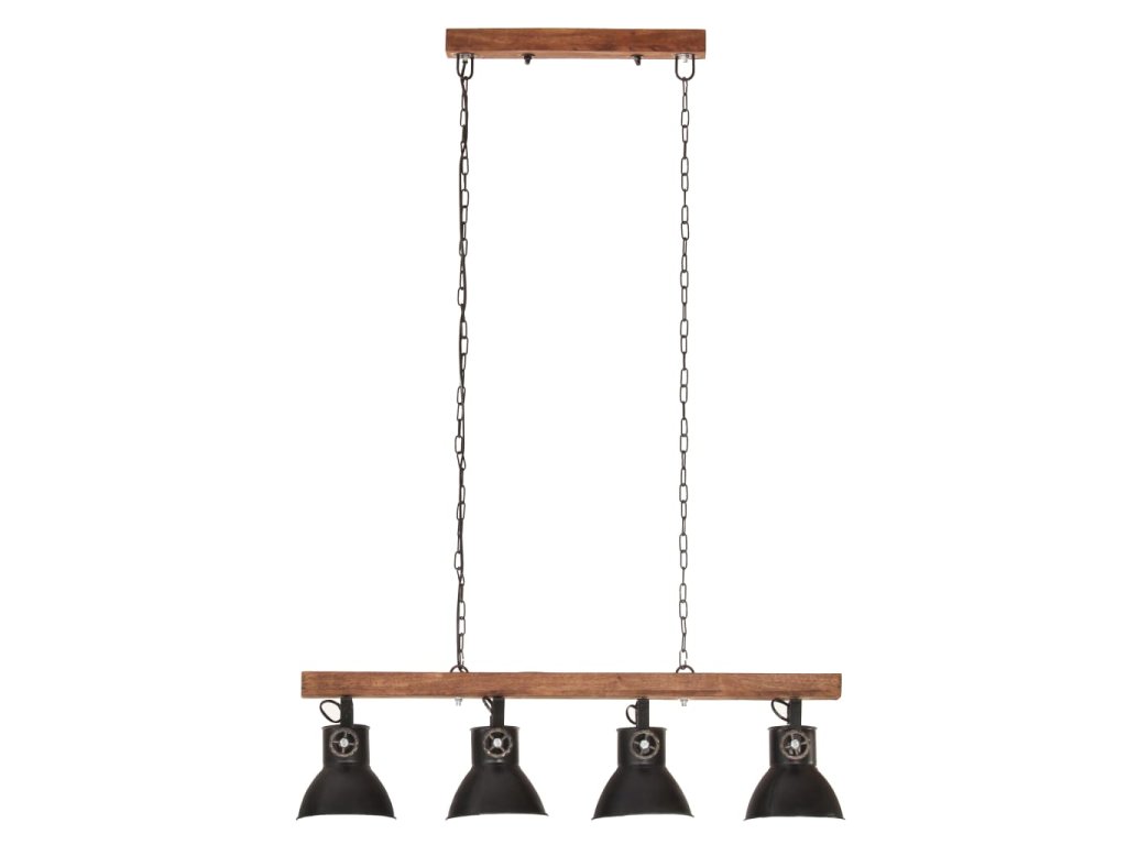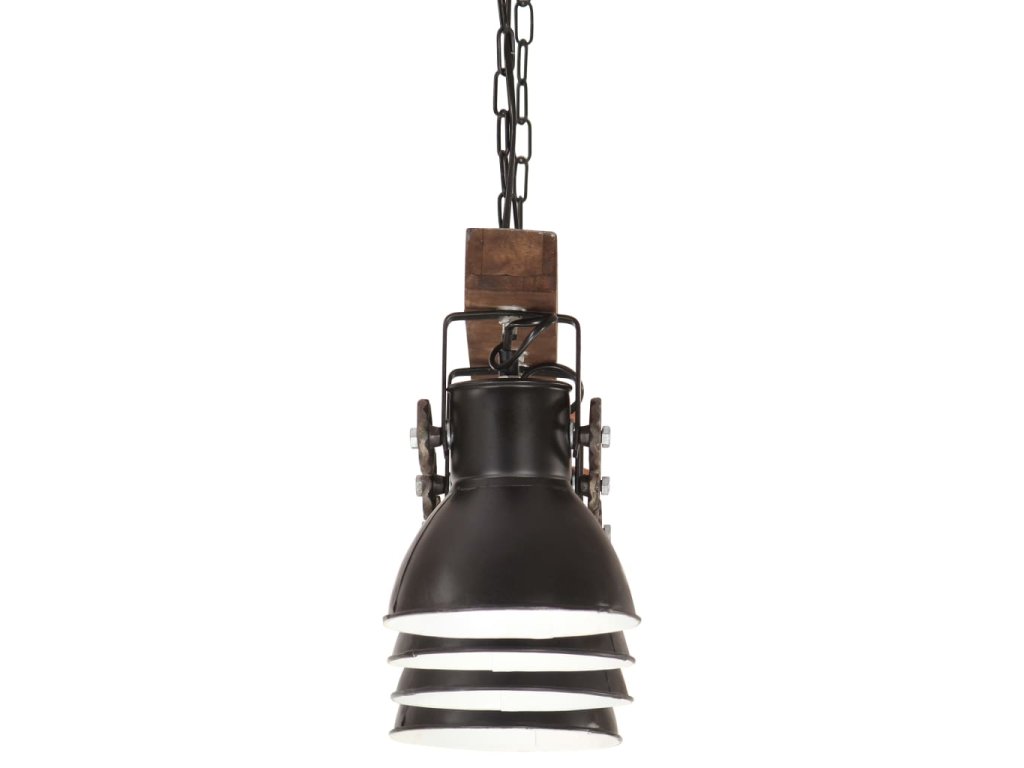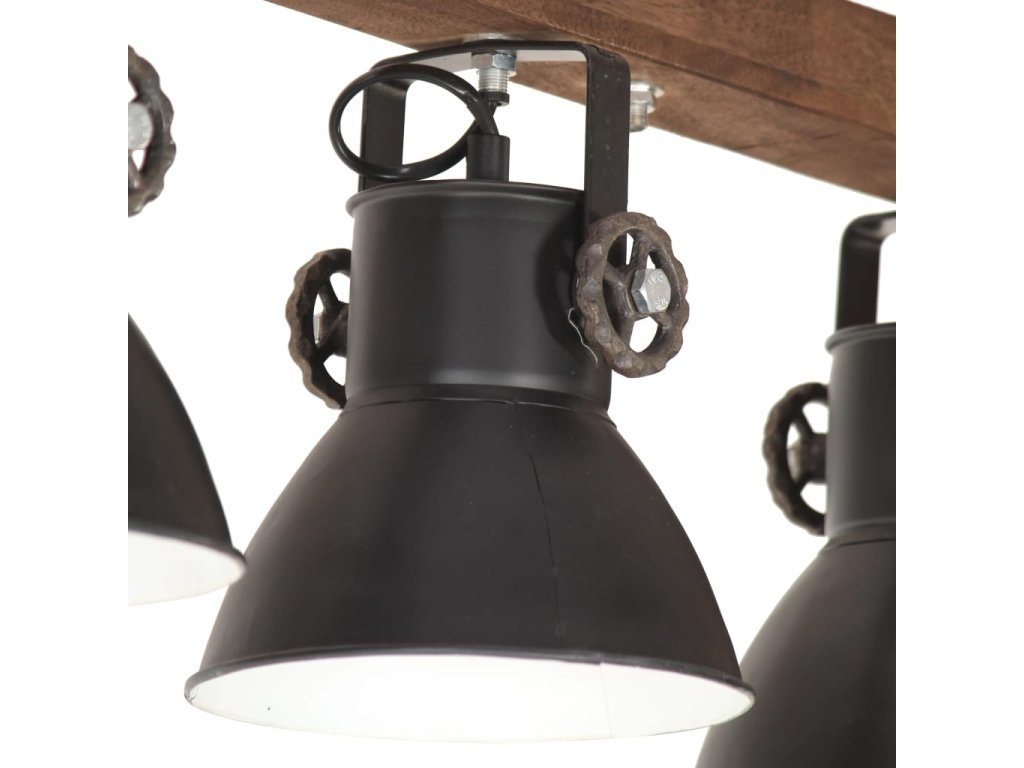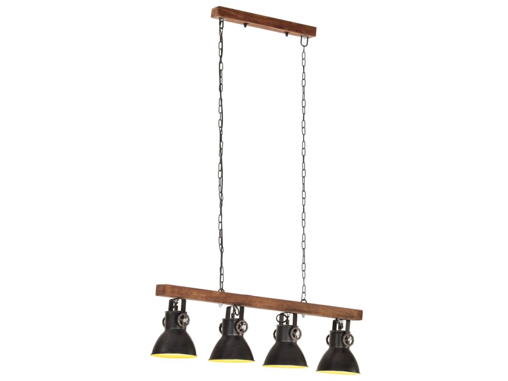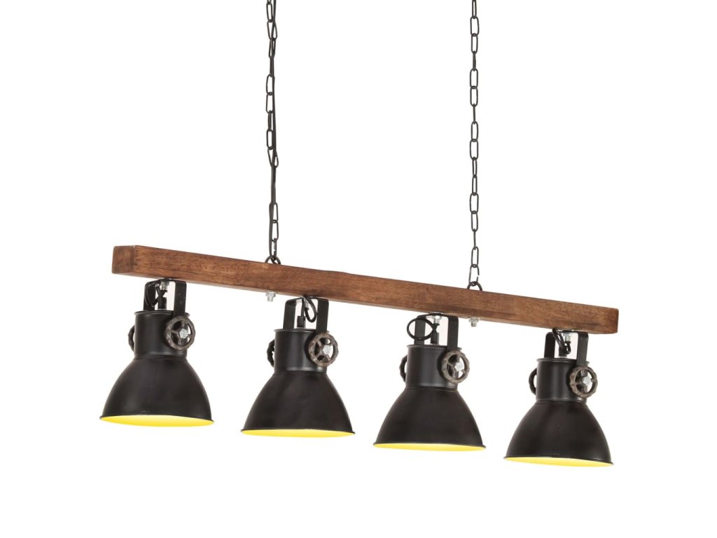 Železné tienidlá s čiernou povrchovou úpravou a z masívneho mangovníkového dreva s povrchovou úpravou v zvetranej hnedej sa perfektne hodí do interiéru vo vidieckom alebo priemyselnom štýle. Stropné svietidlo so 4 tienidlami má objímku E27 pre žiarovku s maximálne 25 wattmi. Môžete si vybrať a nainštalovať žiarovky E27 s rôznymi farbami svetla, ktoré vytvárajú atmosféru relaxácie a pokoja.