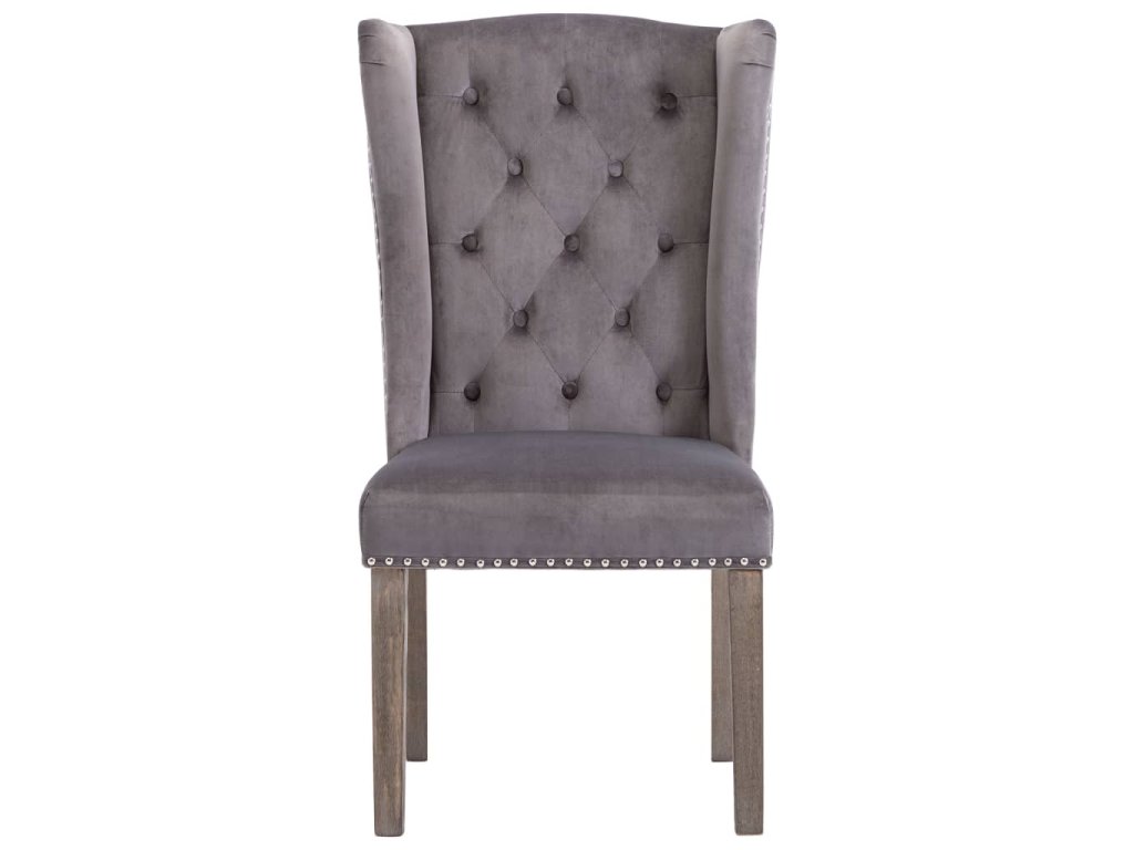 Táto jedálenská stolička, čalúnená zamatovou látkou príjemnou na dotyk, poskytuje pohodlné miesto pre stolovanie, čítanie alebo len pre oddych. Dekoratívny gombík na operadle a kovové nity pozdĺž okrajov dodávajú stoličke klasickú krásu. Jedálenská sedačka má pevné nohy z kaučukovníkového dreva a je stabilná a pevná.