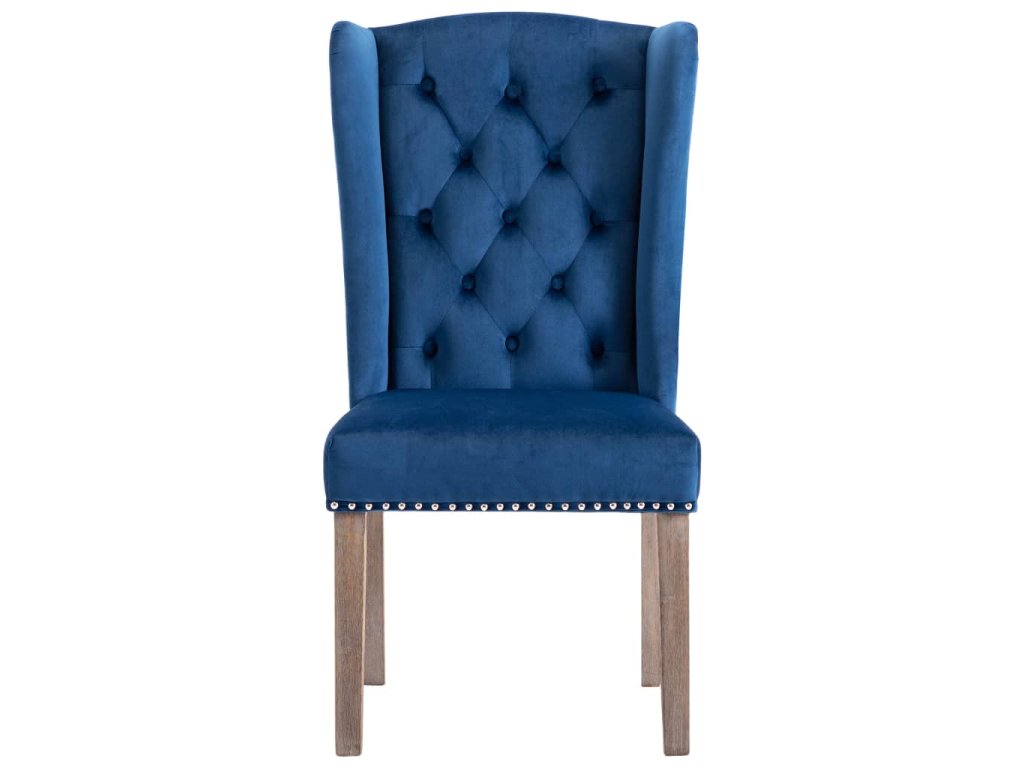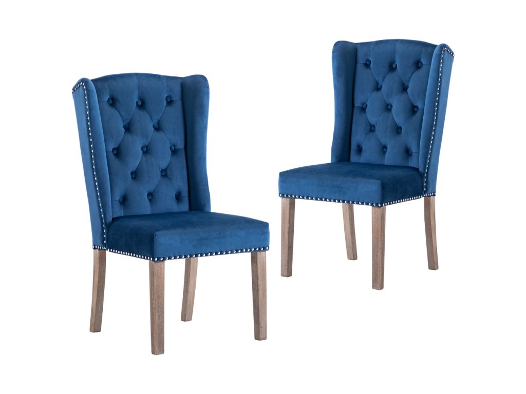 Tieto jedálenské stoličky, čalúnené zamatovou látkou príjemnou na dotyk, poskytujú pohodlné miesto pre stolovanie, čítanie alebo len pre oddych. Dekoratívny gombík na operadle a kovové nity pozdĺž okrajov dodávajú stoličke klasickú krásu. Jedálenské sedačky majú pevné nohy z kaučukovníkového dreva a sú stabilné a pevné.