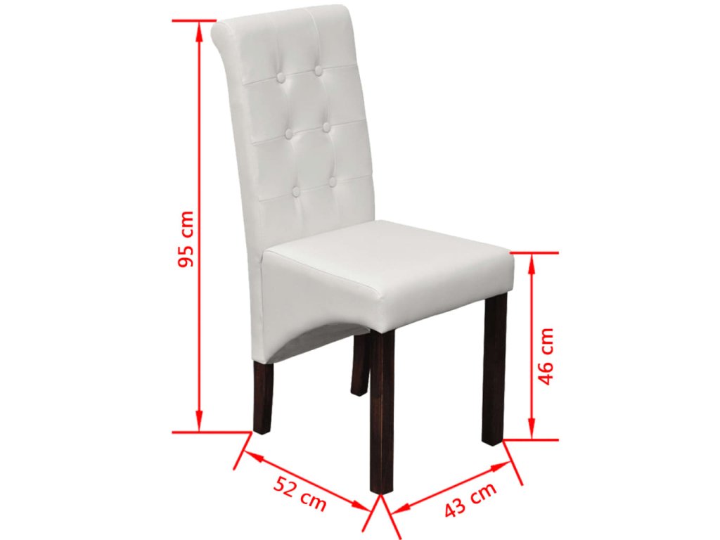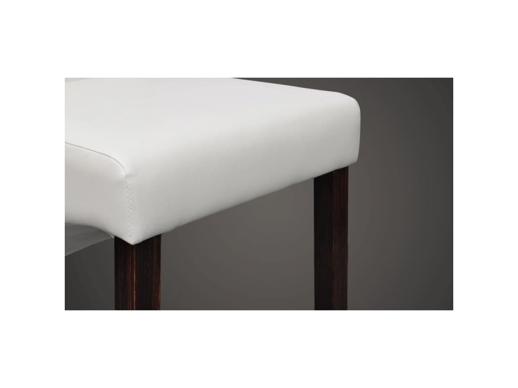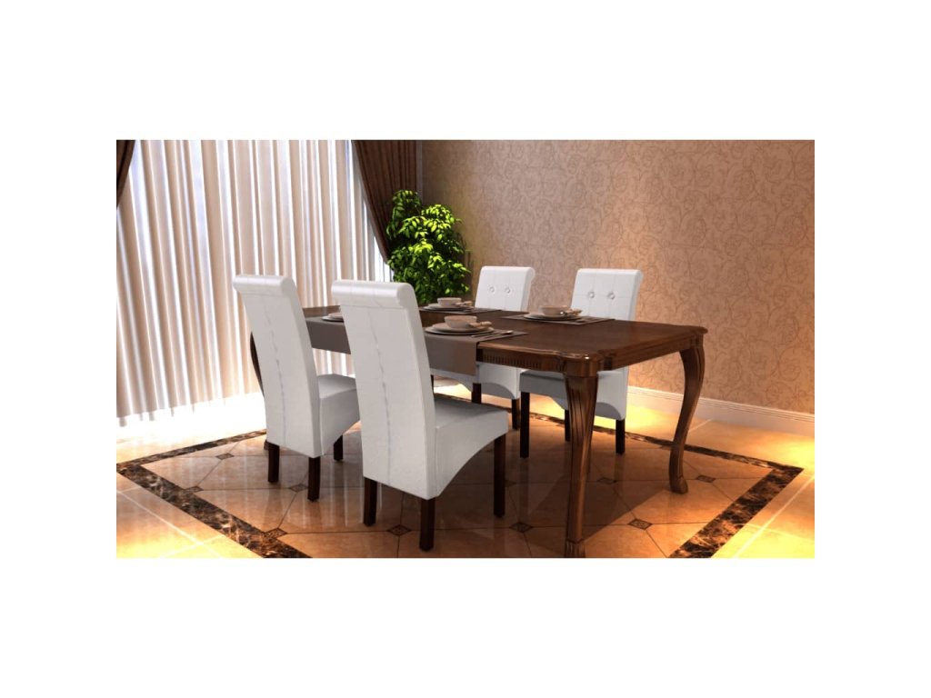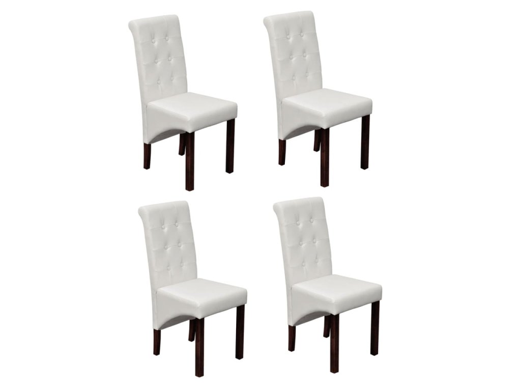 Táto sada pozostáva zo 4 pohodlných a veľkých jedálenských stoličiek so starožitným dizajnom a ergonomicky tvarovanými sedadlami a operadlami. Nohy sú vyrobené z dreveného masívu, ktorý bol ošetrený tmavohnedým lakom, a majú zaoblené okraje pre väčšiu bezpečnosť. Stoličky si nevyžadujú náročnú údržbu a dajú sa jednoducho očistiť. Sedadlá a operadlá sú čalúnené trvácnou syntetickou kožou.