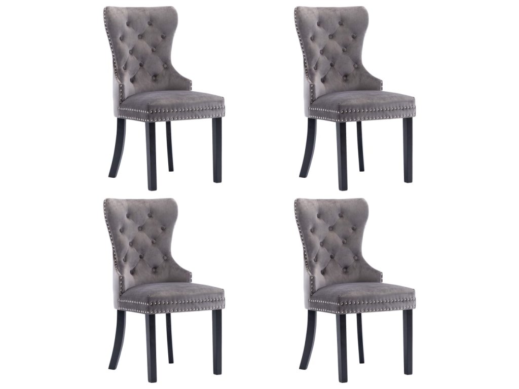 Tieto jedálenské stoličky, čalúnené zamatovou látkou príjemnou na dotyk, poskytujú pohodlné miesto pre stolovanie, čítanie alebo len pre oddych. Dekoratívny gombík na operadle a kovové nity pozdĺž okrajov dodávajú stoličke klasickú krásu. Jedálenské sedačky majú pevné nohy z kaučukovníkového dreva a sú stabilné a pevné.