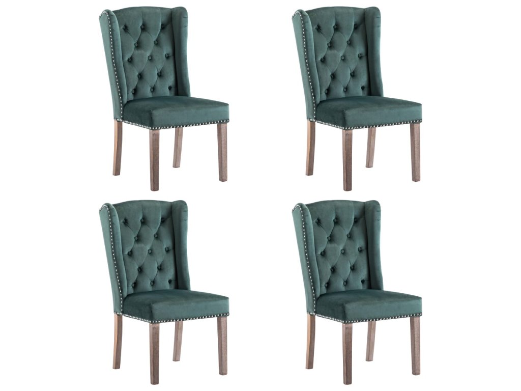Tieto jedálenské stoličky, čalúnené zamatovou látkou príjemnou na dotyk, poskytujú pohodlné miesto pre stolovanie, čítanie alebo len pre oddych. Dekoratívny gombík na operadle a kovové nity pozdĺž okrajov dodávajú stoličke klasickú krásu. Jedálenské sedačky majú pevné nohy z kaučukovníkového dreva a sú stabilné a pevné.