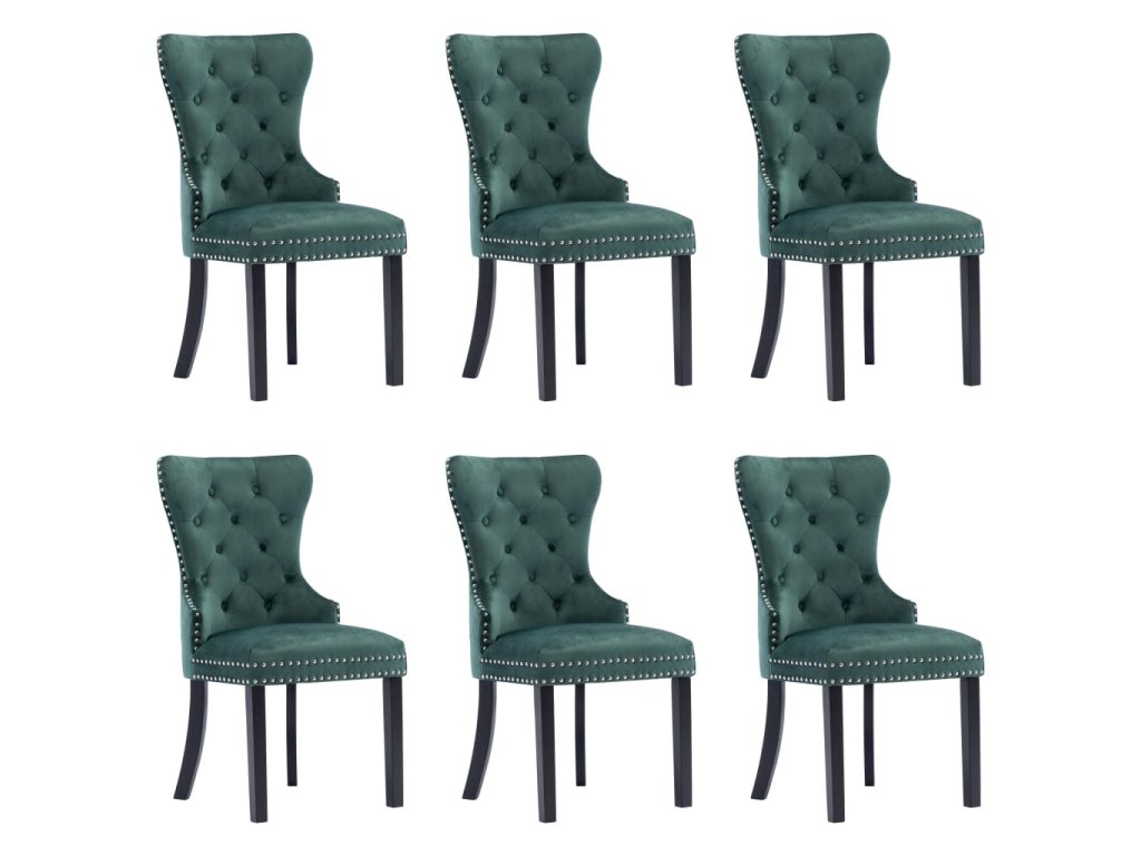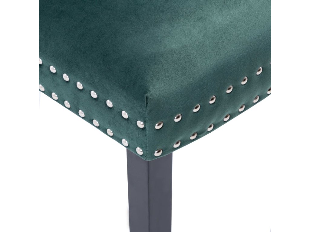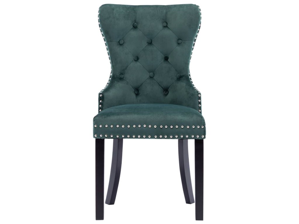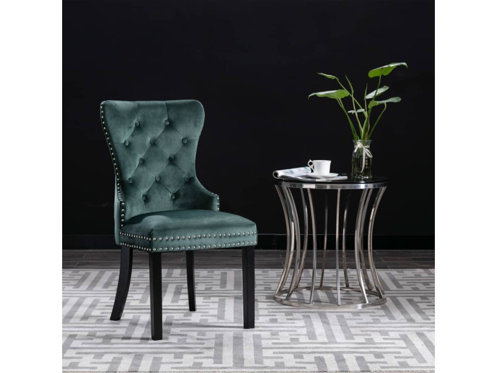 Tieto jedálenské stoličky, čalúnené zamatovou látkou príjemnou na dotyk, poskytujú pohodlné miesto pre stolovanie, čítanie alebo len pre oddych. Dekoratívny gombík na operadle a kovové nity pozdĺž okrajov dodávajú stoličke klasickú krásu. Jedálenské sedačky majú pevné nohy z kaučukovníkového dreva a sú stabilné a pevné.