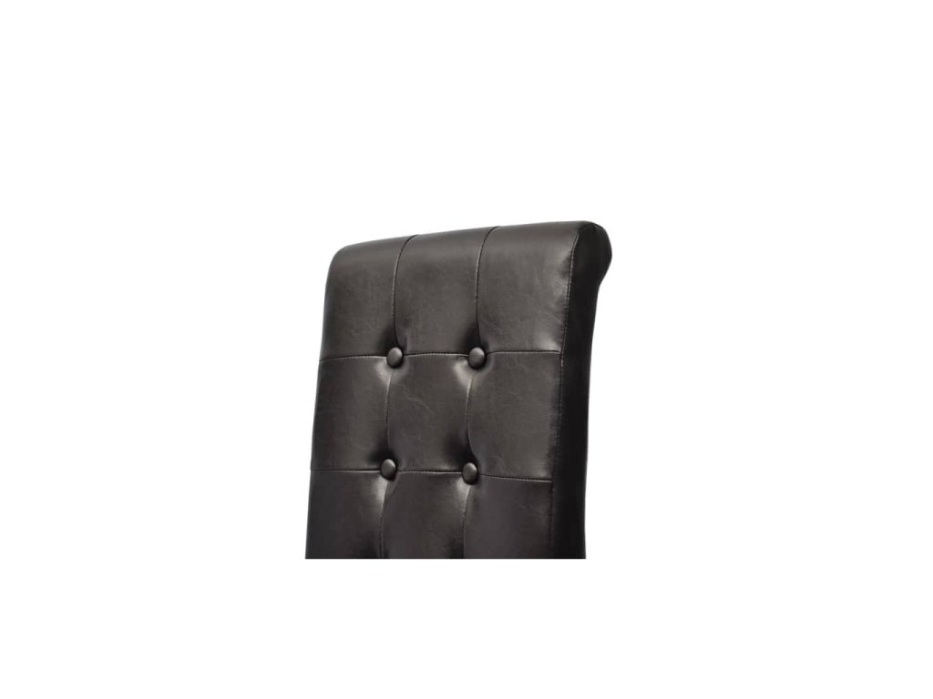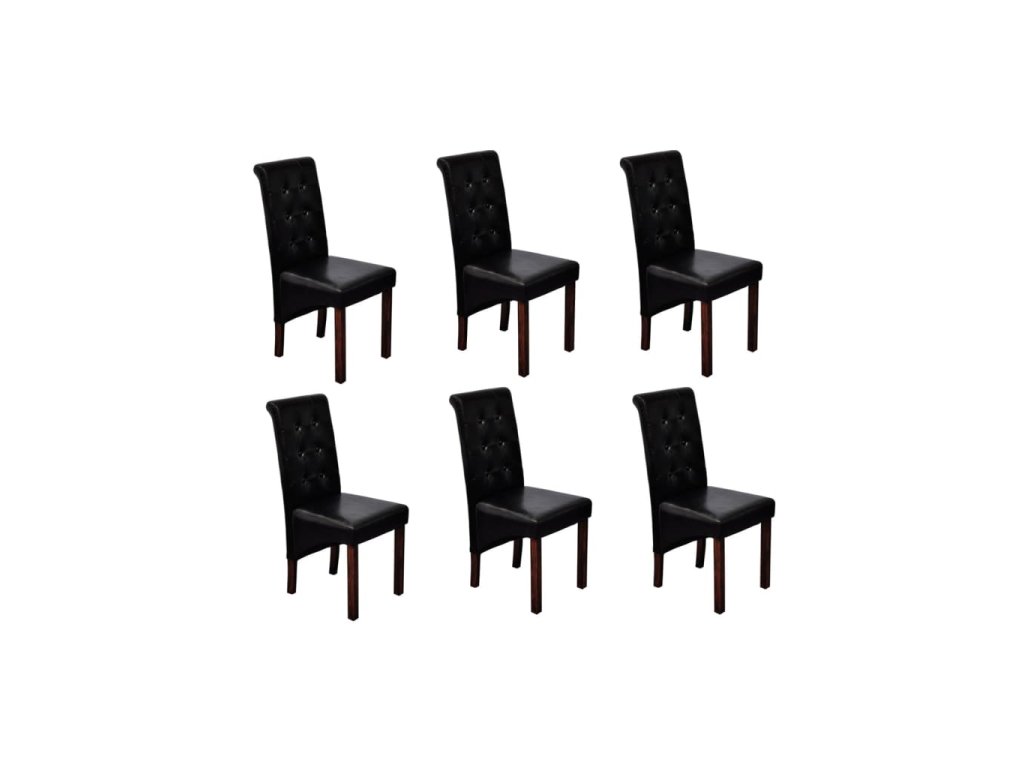 Táto sada pozostáva zo 6 pohodlných a veľkých jedálenských stoličiek so starožitným dizajnom a ergonomicky tvarovanými sedadlami a operadlami. Nohy sú vyrobené z dreveného masívu, ktorý bol ošetrený tmavohnedým lakom, a majú zaoblené okraje pre väčšiu bezpečnosť. Stoličky si nevyžadujú náročnú údržbu a dajú sa jednoducho očistiť. Sedadlá a operadlá sú čalúnené trvácnou syntetickou kožou.