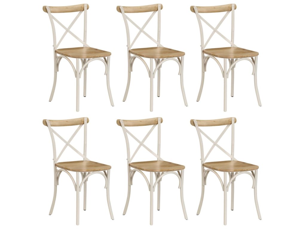 Táto 6-dielna jedálenská súprava stoličiek z mangovníkového dreva v antickom štýle predstavuje jedinečný doplnok, ktorý pritiahne pozornosť. Oceľové rámy dodávajú stoličkám značnú stabilitu a pevnosť.