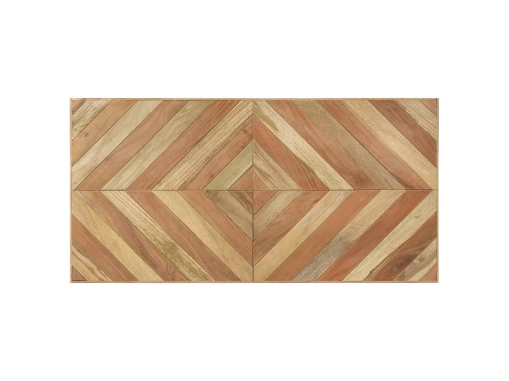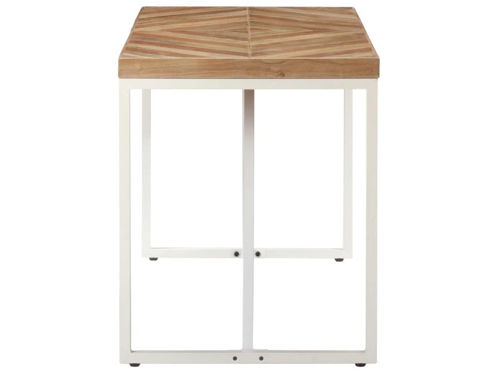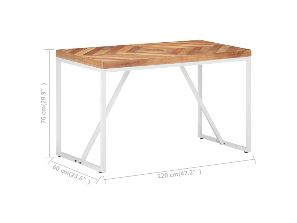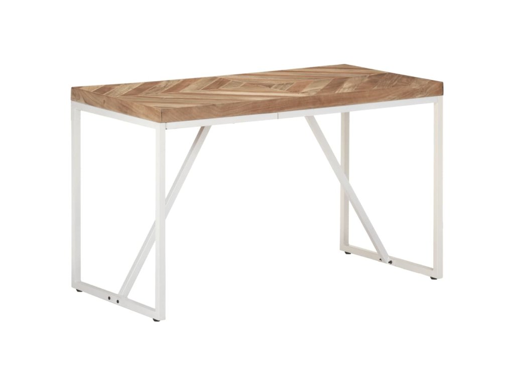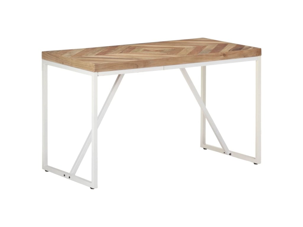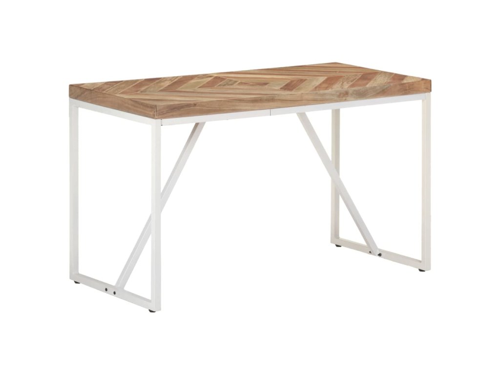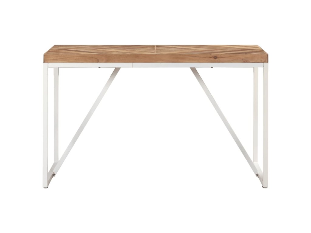 Tento jedálenský stôl bol ručne vyrobený z masívneho akáciového a mangovníkového dreva, takže je veľmi stabilný a odolný. Biele oceľové nohy s práškovaným nástrekom poskytujú dodatočnú stabilitu. Robustná stolová doska má tvar šípu a mozaikový dizajn, vďaka čomu vytvorí špeciálny doplnok vo vašom interiéri. Môže sa tiež použiť na umiestnenie nápojov alebo občerstvenia.