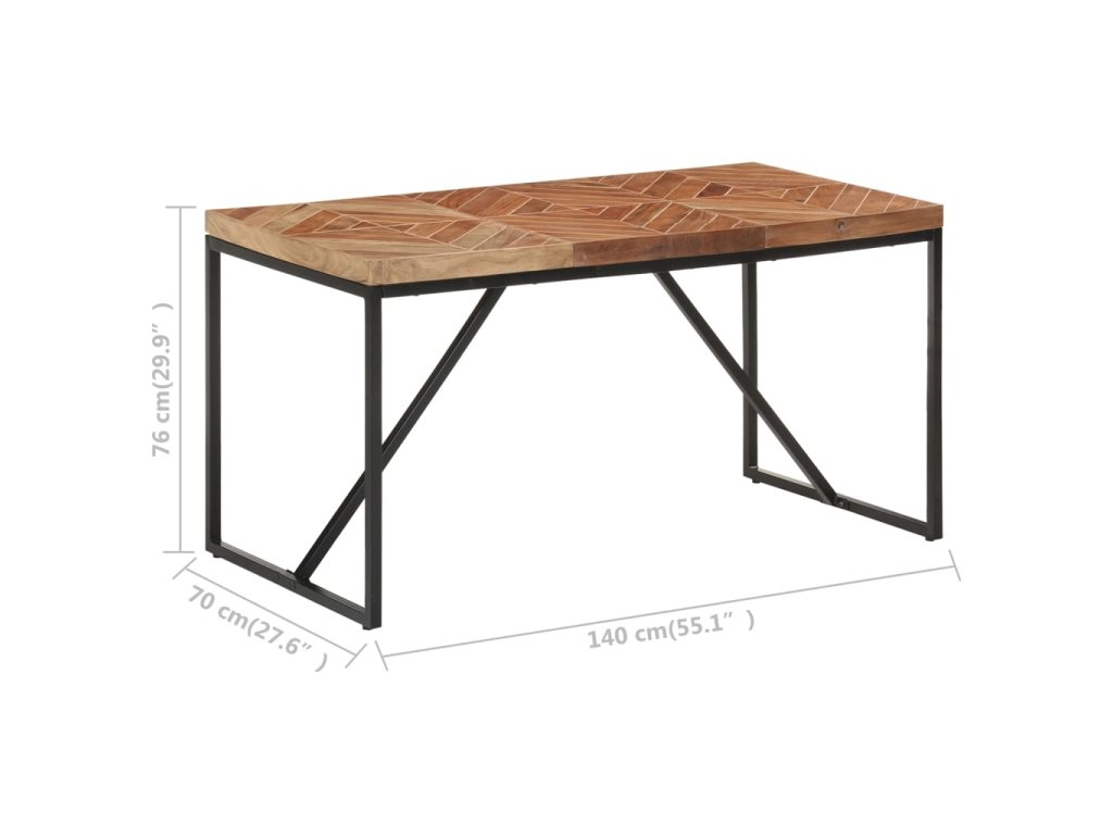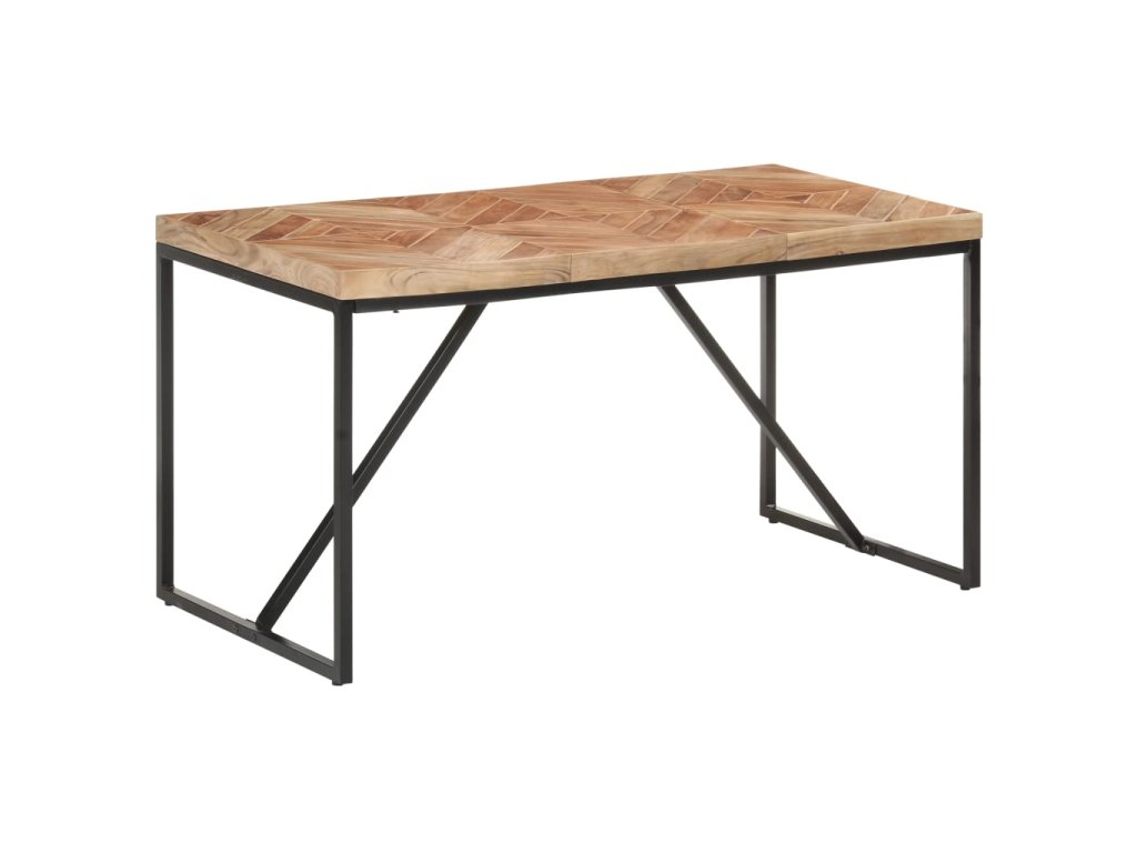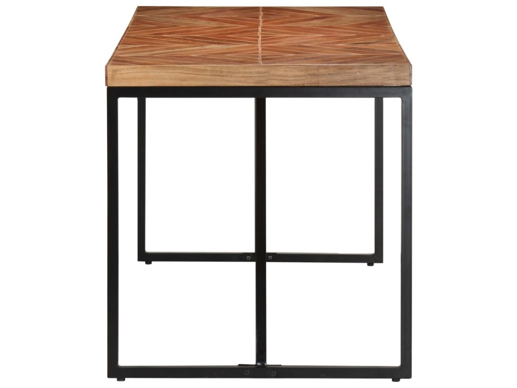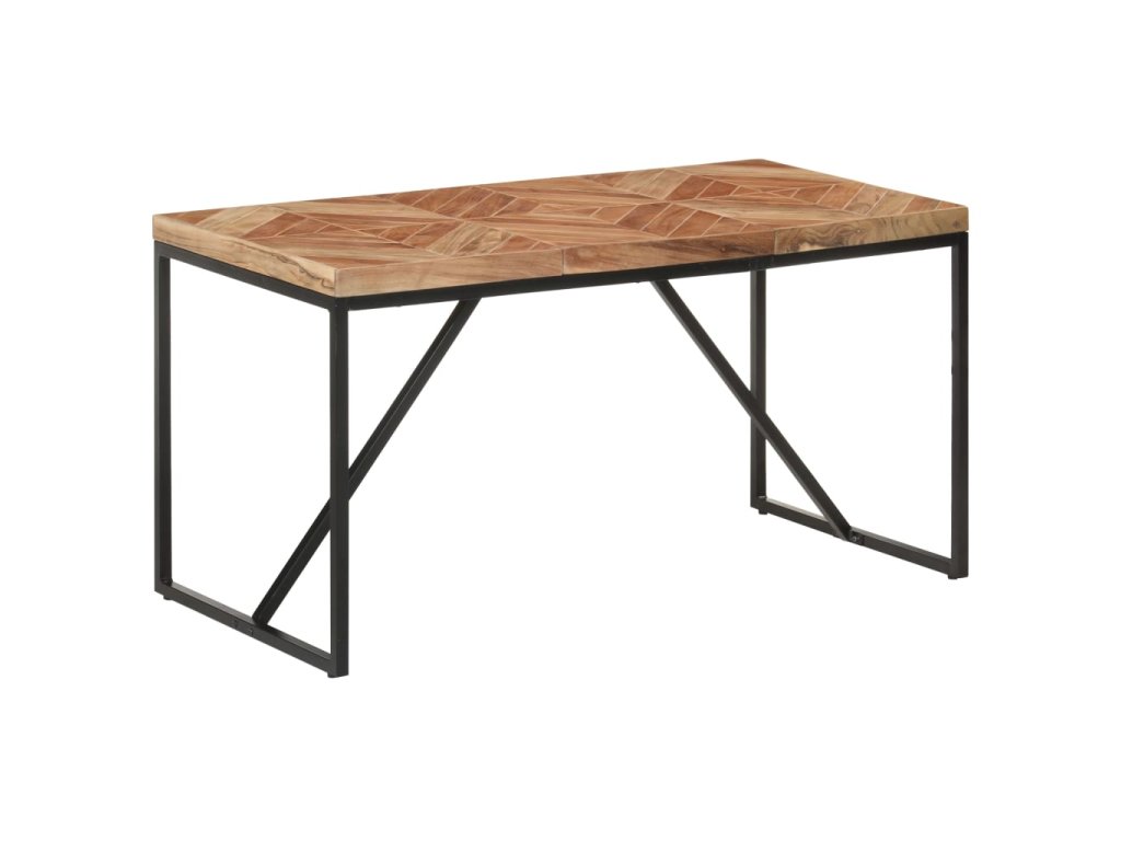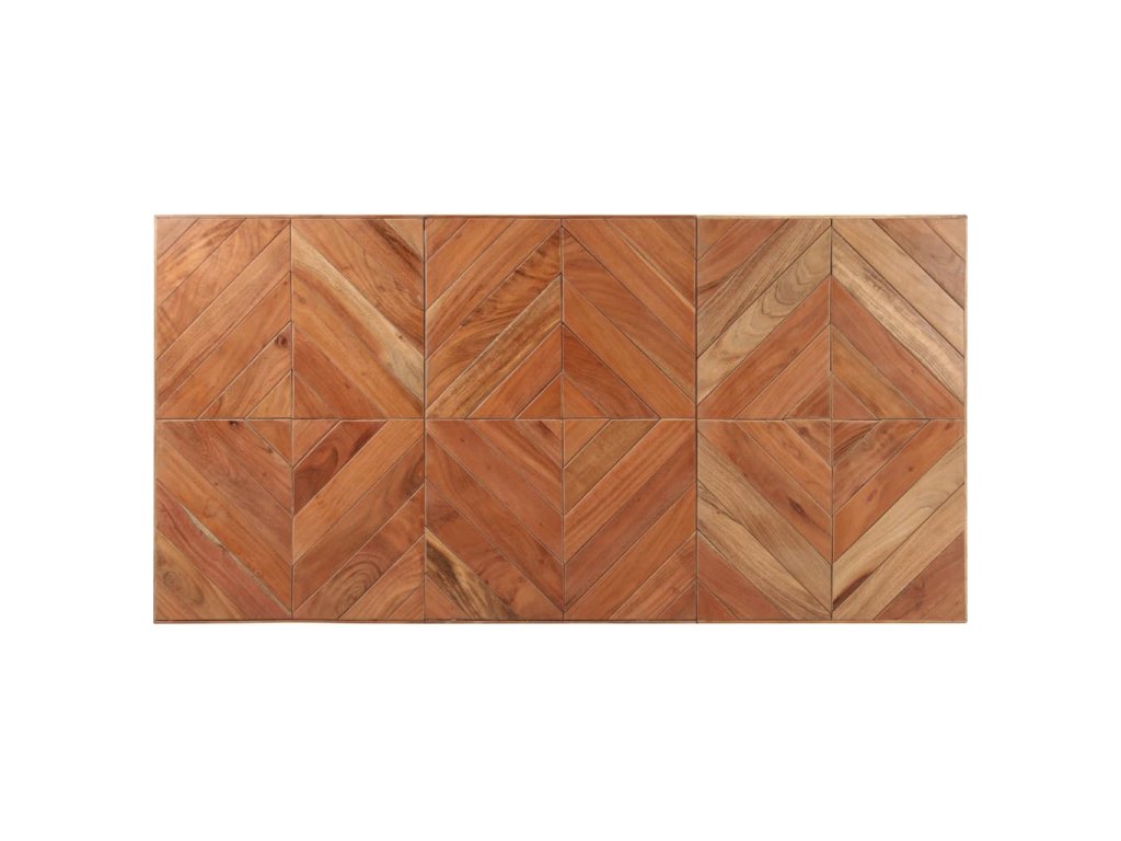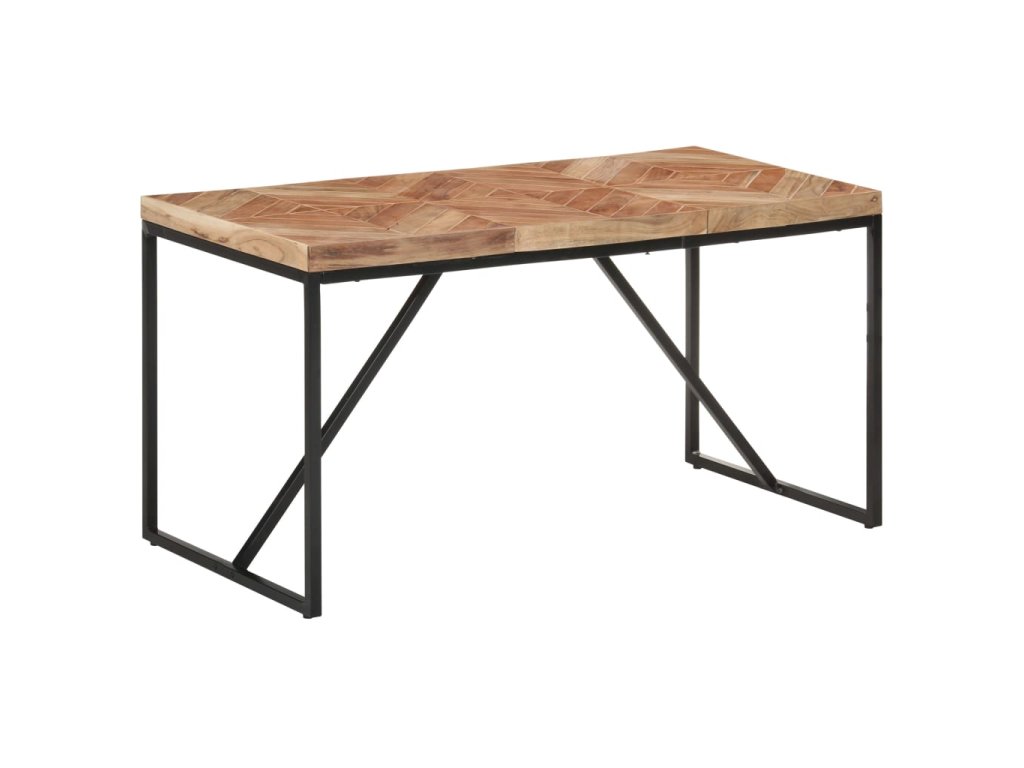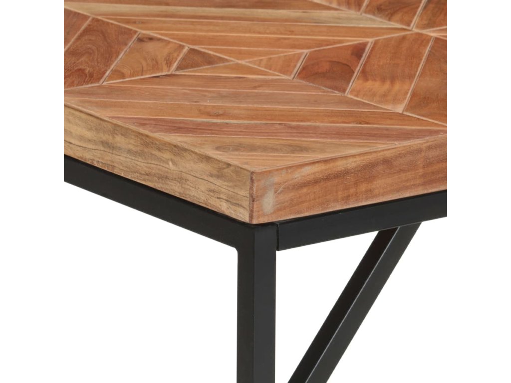Tento jedálenský stôl je ručne vyrobený z masívneho akáciového a mangovníkového dreva, a je veľmi stabilný a odolný. Mangovníkové drevo je tvrdé drevo s bohatou štruktúrou a akáciové drevo je tiež tropické tvrdé drevo, ktoré je odolné voči poveternostným vplyvom. Každý krok procesu výroby sa vykonáva s najväčšou starostlivosťou, či už ide o leštenie, natieranie alebo lakovanie. Čierne oceľové nohy s práškovým povrchom poskytujú dodatočnú stabilitu. Robustná stolová doska má tvar šípu a mozaiky, vďaka čomu vytvorí špeciálny doplnok vo vašom interiéri. Môže sa tiež použiť na umiestnenie nápojov alebo občerstvenia.