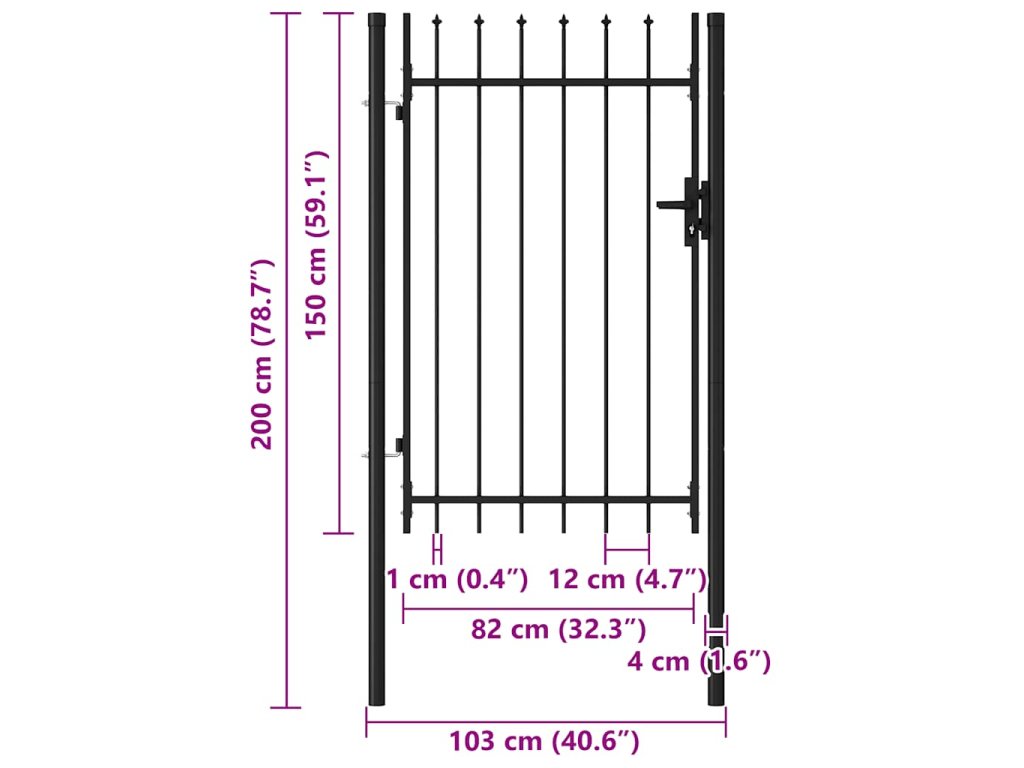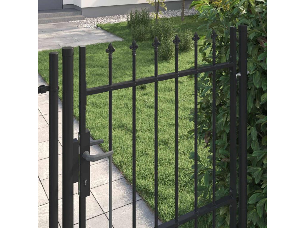 Brána pozostáva zo zvislých stĺpikov s hrotmi a z pevných vodorovných oporných tyčí, vďaka čomu zabezpečuje optimálnu bezpečnosť a súkromie a zároveň vytvára pôsobivý vstup na pozemok. Je vyrobená z odolnej ocele s práškovou povrchovou úpravou, vďaka čomu nepodlieha hrdzi ani korózii.