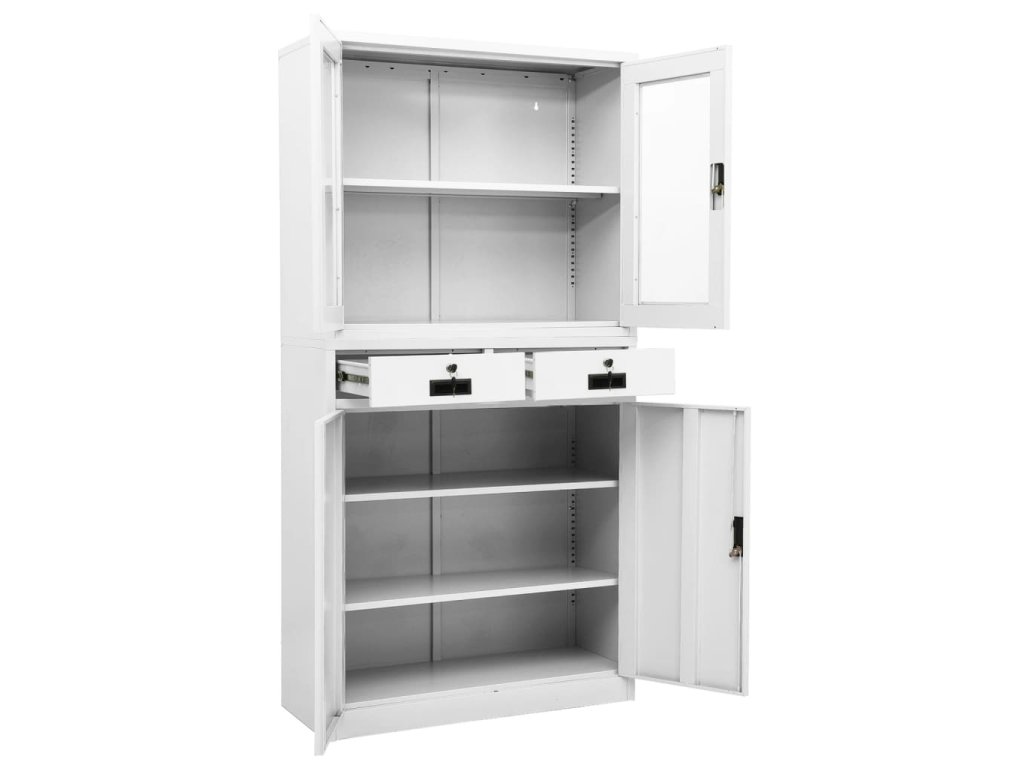 Táto kancelárska skrinka je vyrobená z ocele, vďaka čomu je odolná a ľahko sa čistí. Vďaka 3 nastaviteľným policiam vám umožňuje prehľadne triediť šanóny do rôznych kategórií a uchovávať ich v bezpečí. 2 vrchné dvierka majú okienko z tvrdeného skla, vďaka ktorému ľahšie nájdete potrebné položky. Zásuvky s 3-dielnymi guličkovými koľajnicami zaisťujú plynulé otváranie a zatváranie aj pri zvýšenej záťaži. Táto skrinka sa vďaka svojmu ikonickému dizajnu bude hodiť do každej kancelárie.