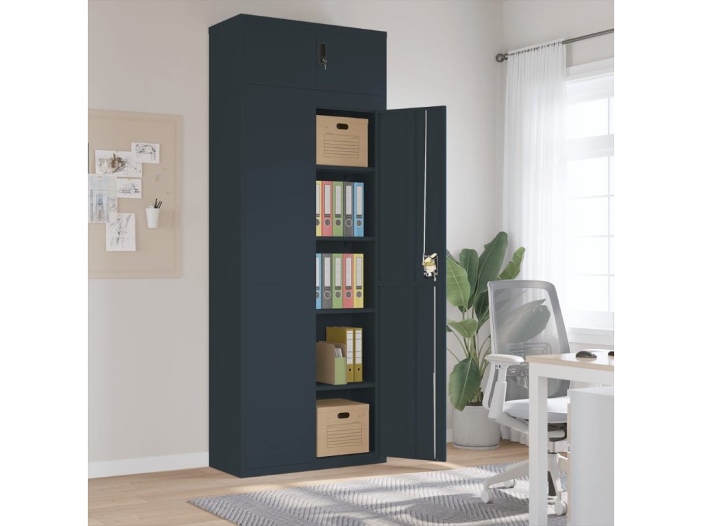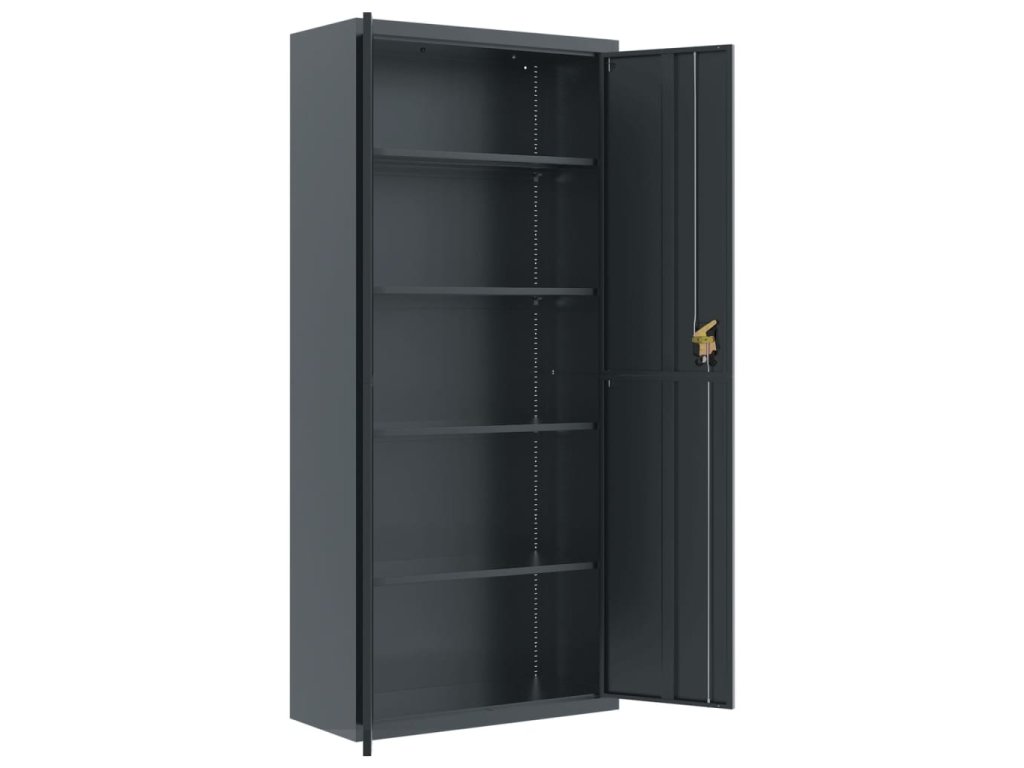 - Nastaviteľné police: Úložná skrinka obsahuje 4 nastaviteľné police, ktoré vám umožňujú prehľadne triediť šanóny do rôznych kategórií.