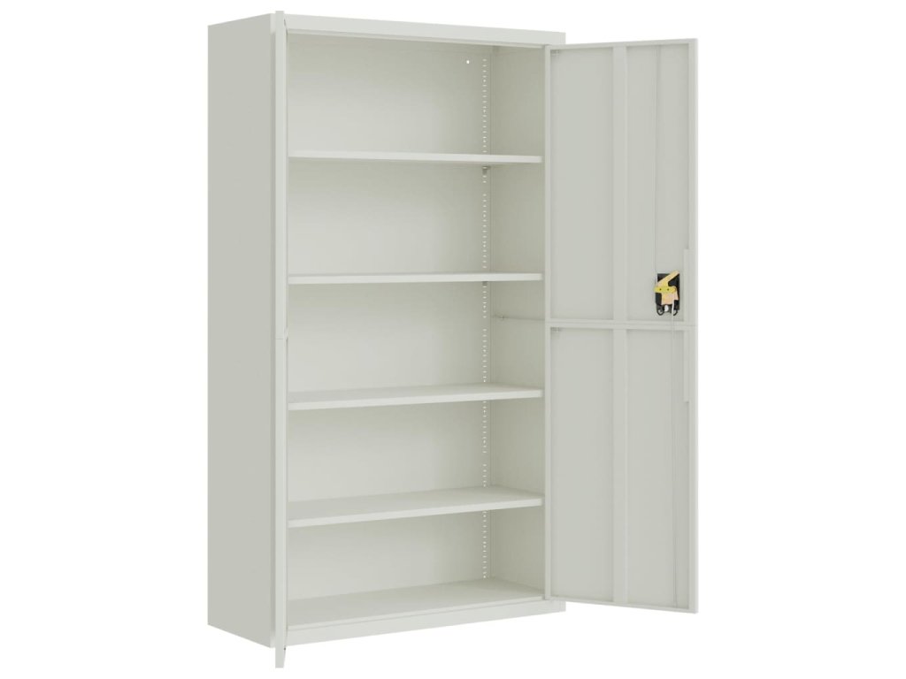 - Nastaviteľné police: Úložná skrinka obsahuje 4 nastaviteľné police, ktoré vám umožňujú prehľadne triediť šanóny do rôznych kategórií.