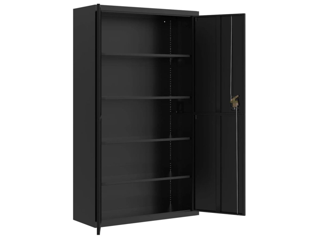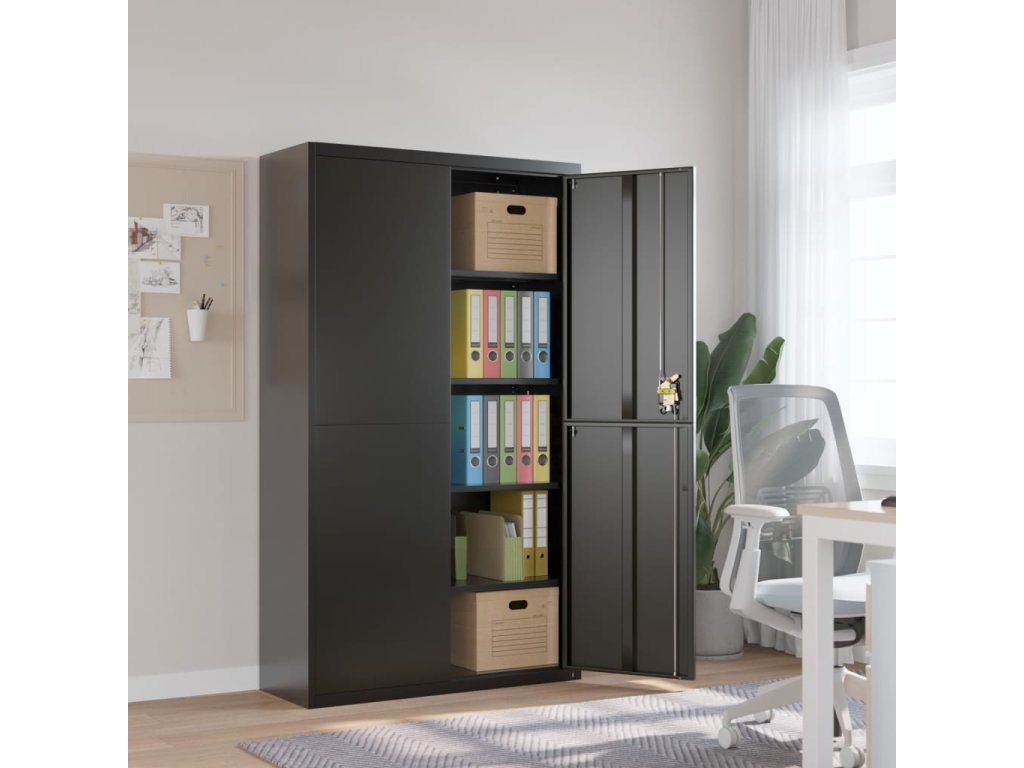 - Nastaviteľné police: Úložná skrinka obsahuje 4 nastaviteľné police, ktoré vám umožňujú prehľadne triediť šanóny do rôznych kategórií.