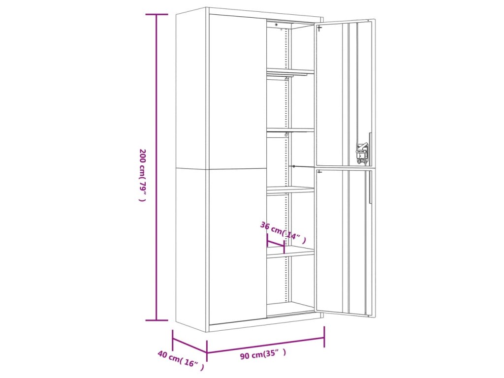 - Nastaviteľné police: Úložná skrinka obsahuje 4 nastaviteľné police, ktoré vám umožňujú prehľadne triediť šanóny do rôznych kategórií.