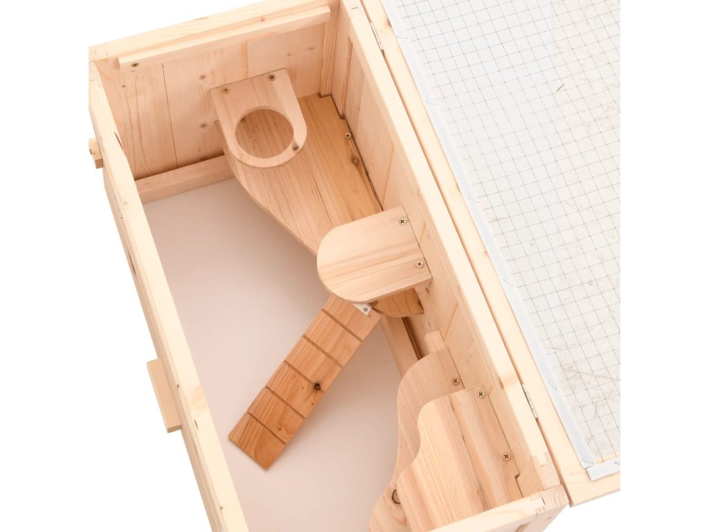 - Masívne jedľové drevo: Masívne jedľové drevo je krásny prírodný materiál. Jedľové drevo nevyschne ani sa nezdeformuje, keď je vystavené vlhkosti. Domček pre škrečky je vyrobený z masívneho jedľového dreva a je odolný a ľahko sa čistí.